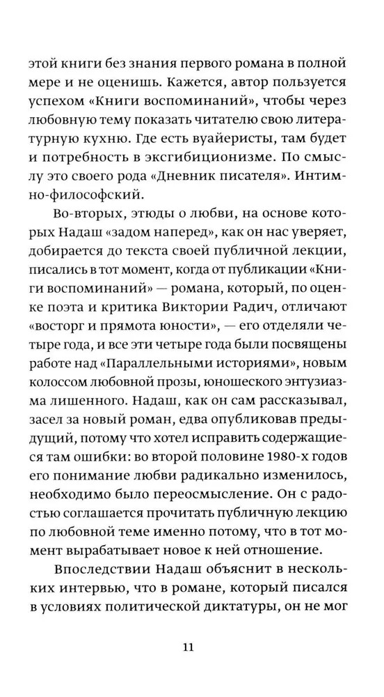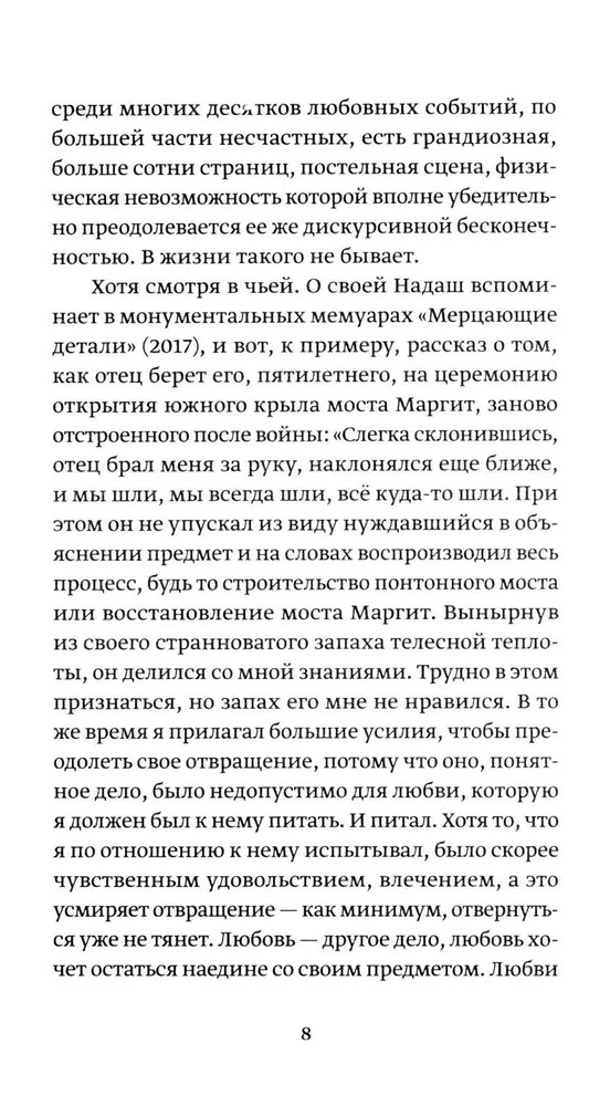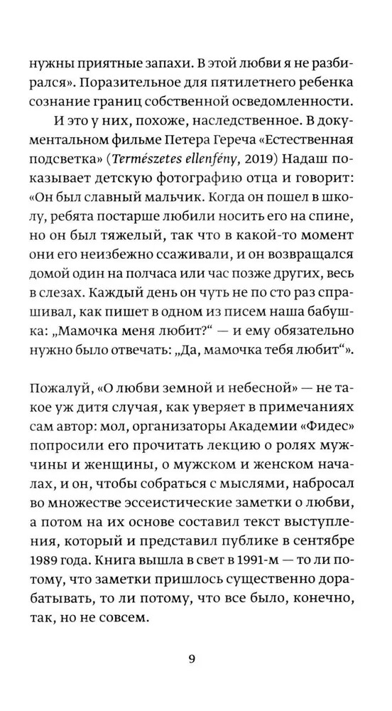 В пространном философском эссе «О любви земной и небесной» всемирно признанный венгерский романист Петер Надаш (р. 1942) исследует нашу неспособность говорить о любви, неумение находить слова для того, что не дает нам покоя. В эссе, название которого отсылает к знаменитой картине Тициана, разбор античных мифов, «Метаморфоз» Овидия и платоновских диалогов сменяется анализом житейских историй, обсценной лексики и любовных норм, предписываемых людям в разных обществах. Рассуждение, в котором разбор одного вопроса ведет к появлению следующего, а Тереза Авильская вступает в разговор с Витгенштейном, заканчивается лекцией, в которой Надаш представляет собственную концепцию любви. Этот текст — работа романиста в амплуа философа, своего рода обратная параллель к «Фрагментам речи влюбленного» Ролана Барта.