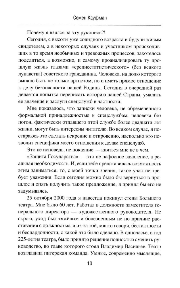 Книга этого человека с незаурядной биографией выходит за рамки привычных для читателя мемуаров. Автор проработал в Большом театре СССР тридцать пять лет, включая учёбу в Московском хореографическом училище. Прошёл путь от солиста балета до заместителя генерального директора — художественного руководителя Большого театра СССР. Казалось бы, сложившаяся артистическая карьера: служение любимому Театру (только с заглавной буквы!), участие в замечательных спектаклях с талантливыми артистами, гастроли по всему свету, овации... Однако параллельно с работой в театре автор оказывал содействие КГБ СССР по линии внешней разведки и контрразведки, выполняя ответственные задания дома и за рубежом.