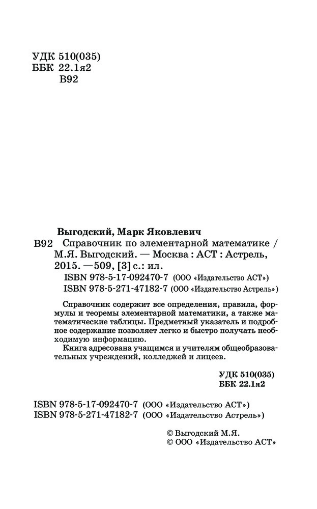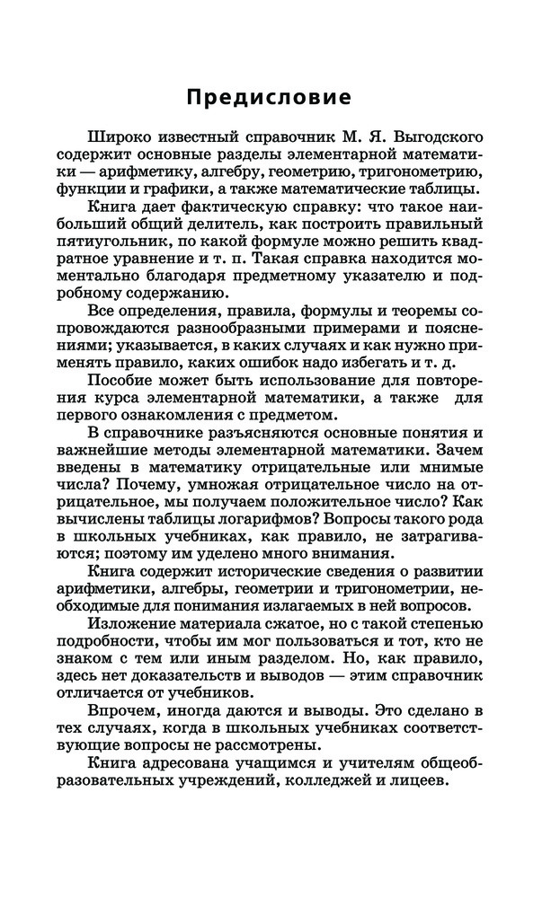 Справочник по элементарной математикеВ данный момент этот товар отсутствует в продаже. Возможно, у нас найдется аналогичный или похожий товар здесь. Серия: Выгодский Справочник содержит все определения, правила, формулы и теоремы элементарной математики, а также математические таблицы. Предметный указатель и подробное содержание позволяют легко и быстро получать необходимую информацию. |