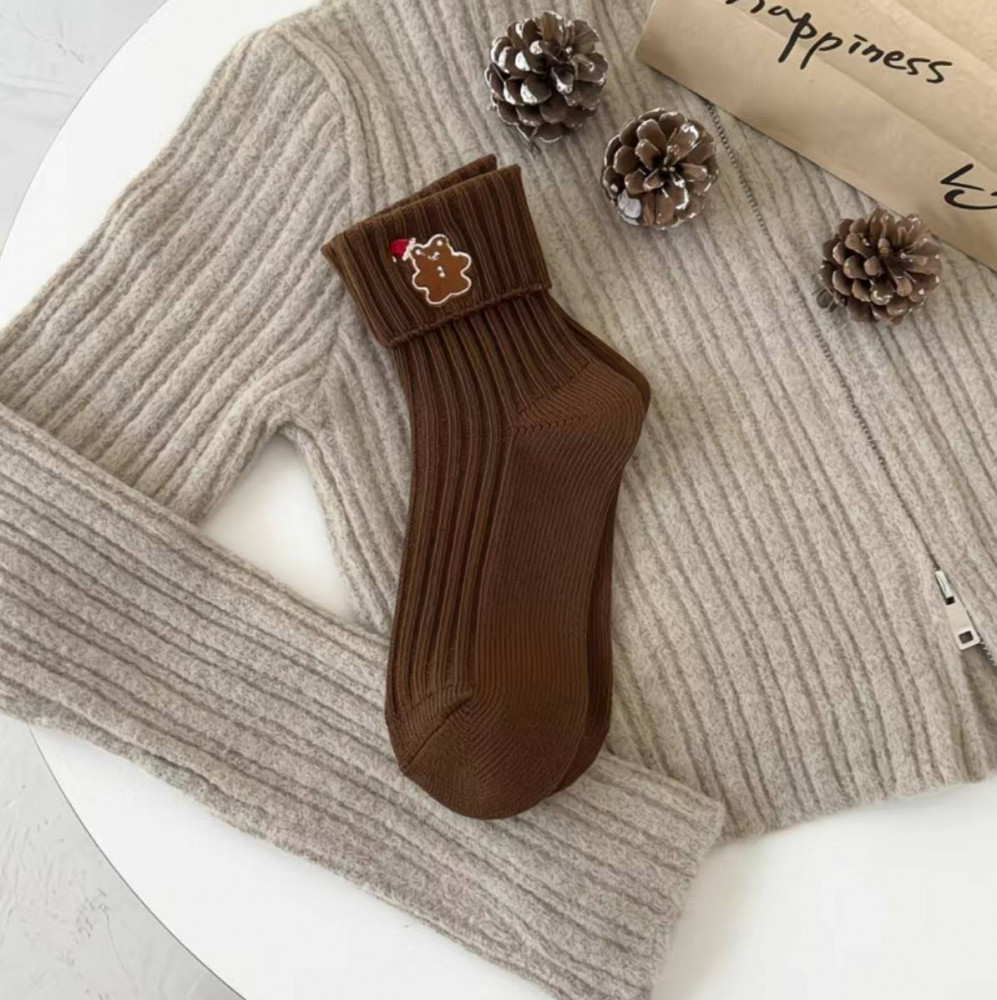 Уютные и мягкие женские носки в насыщенном коричневом цвете. Модель выполнена из плотного, тёплого, хорошо тянущегося трикотажа с вертикальной рубчиковой вязкой. На подвороте — милый нашивной декор в виде пряничного человечка с красным колпачком, добавляющий новогоднего настроения. Идеальны для зимы, прогулок, домашнего уюта или как милый подарок к праздникам. Отлично смотрятся в комбинации с домашними костюмами и тёплыми свитерами.