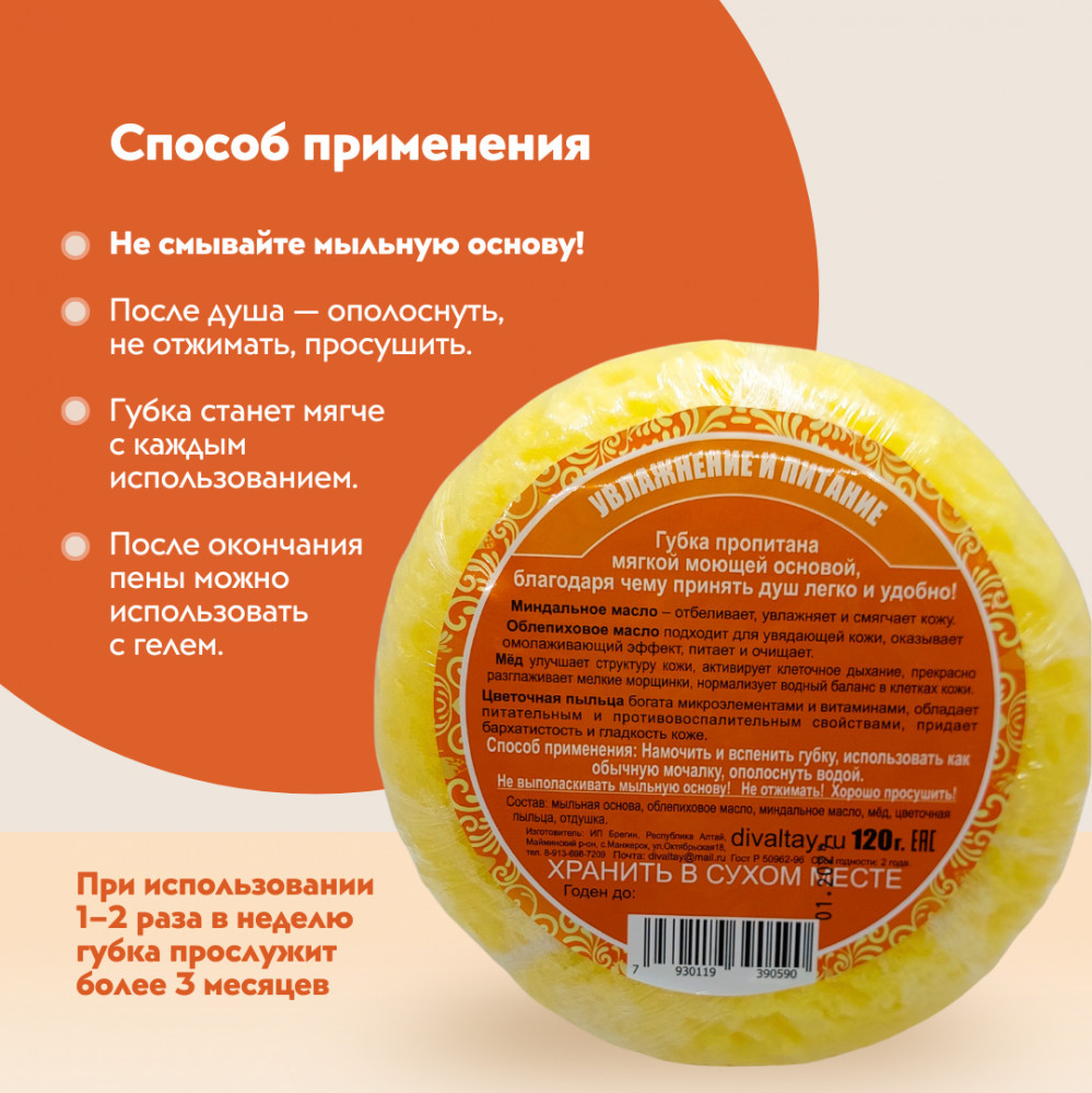 • основой состава губки является один из ценнейших продуктов Алтая — цветочный мёд;