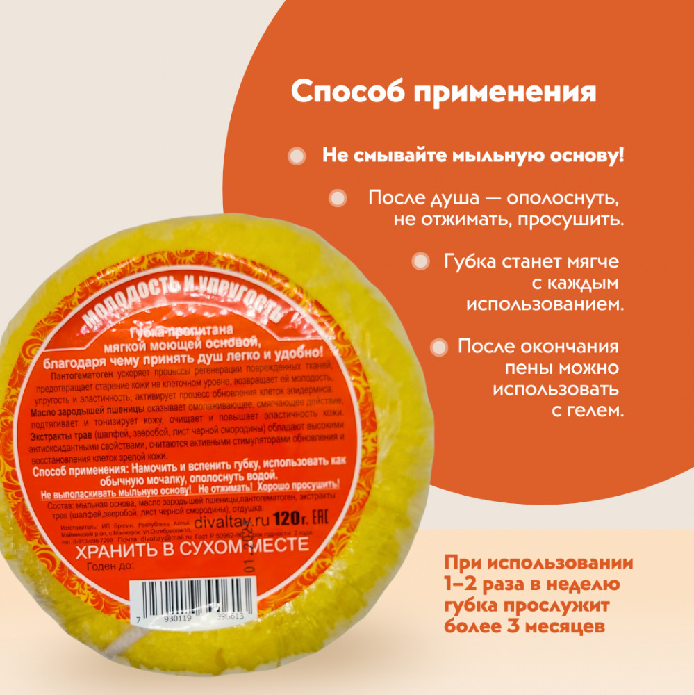 При использовании губки создается эффект мягкого пилинга, поэтому после душа Ваша кожа будет обновленной, отдохнувшей, увлажненной, мягкой и нежной. При рекомендованном использовании 1-2 раза в неделю и правильном уходе, этой губки вам хватит более чем на 3 месяца.