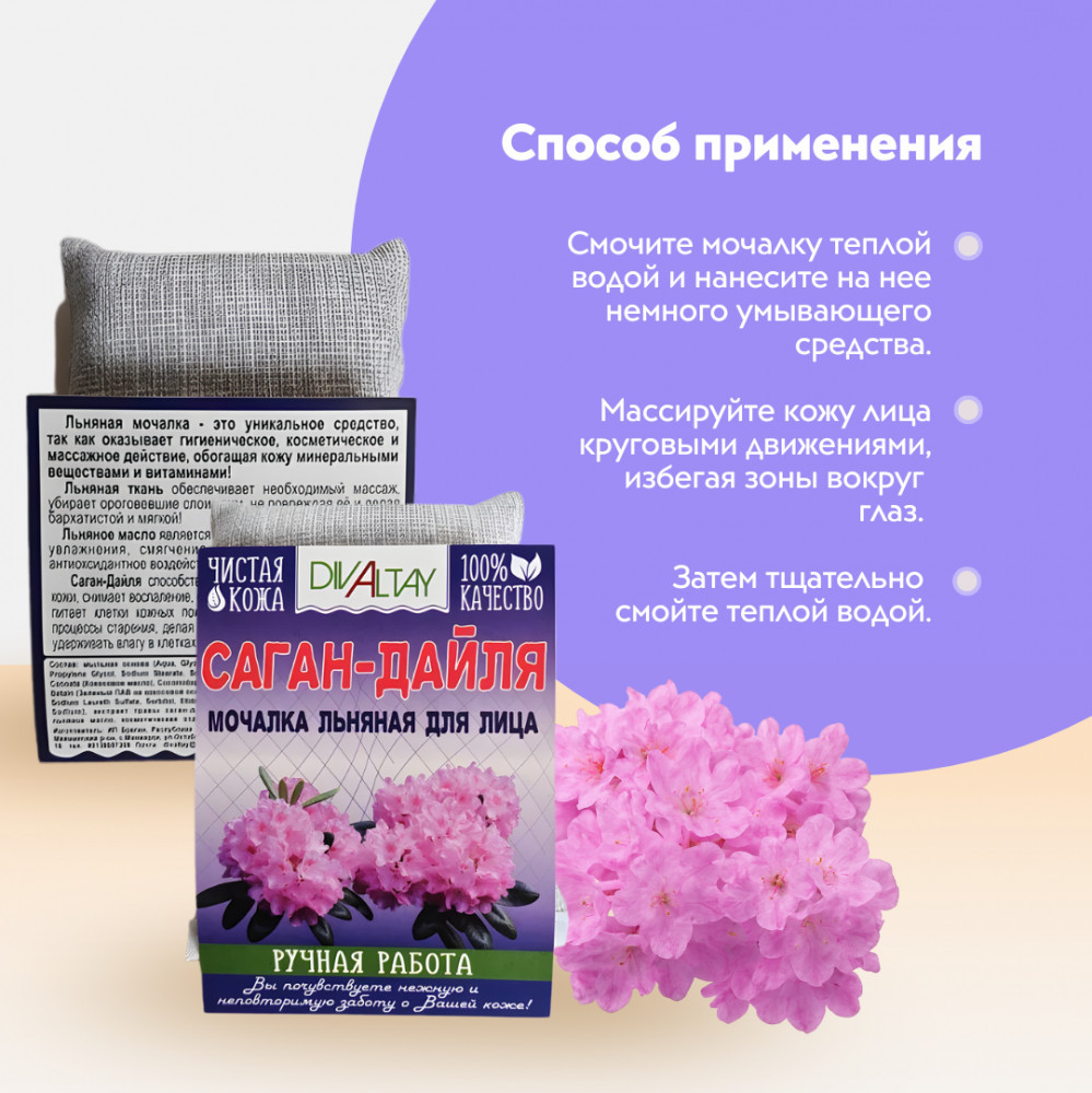 Льняная мочалка для лица «Саган-Дайля» — это идеальное средство для нежного ухода и тонизации кожи лица. Сочетание мягких льняных волокон и экстракта «Саган-Дайля» обеспечивает эффективное и деликатное очищение поры от грязи, избытка кожного жира и других загрязнений, а также способствует улучшению тонуса и эластичности кожи.