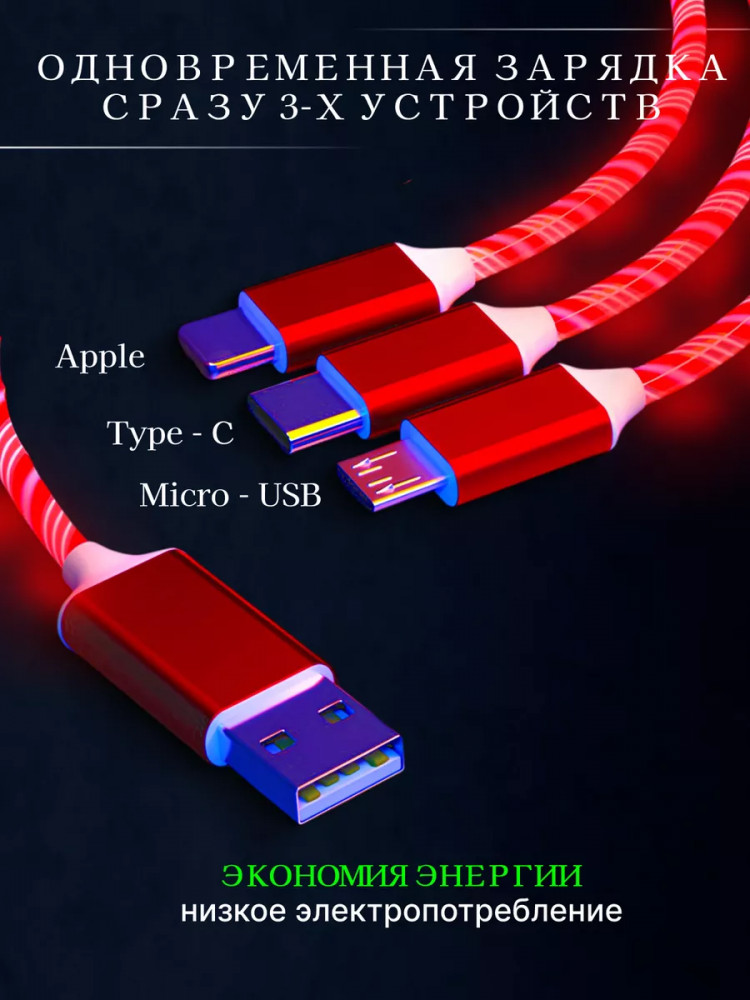 Светящийся кабель 3-в-1 с эффектом «бегущего света» — это стильная, удобная и универсальная зарядка, которая заменяет сразу три кабеля. Благодаря коннекторам Lightning, Type-C и Micro USB провод подходит для 99% современных устройств — смартфонов, планшетов, наушников, колонок, повербанков и гаджетов.