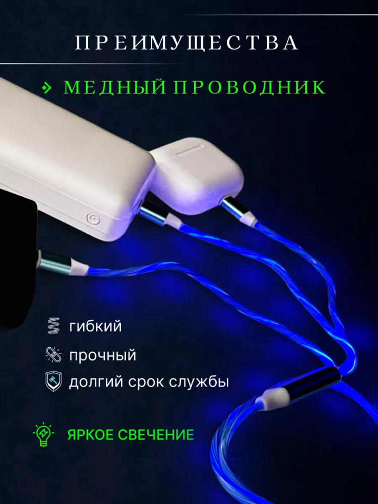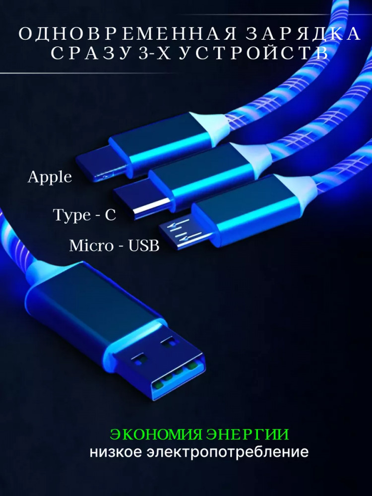 Светящийся кабель 3-в-1 с эффектом «бегущего света» — это стильная, удобная и универсальная зарядка, которая заменяет сразу три кабеля. Благодаря коннекторам Lightning, Type-C и Micro USB провод подходит для 99% современных устройств — смартфонов, планшетов, наушников, колонок, повербанков и гаджетов.