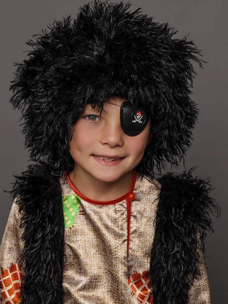 В комплект входит: рубаха, жилетка, брюки с сапогами, шапка и повязка на глаз.