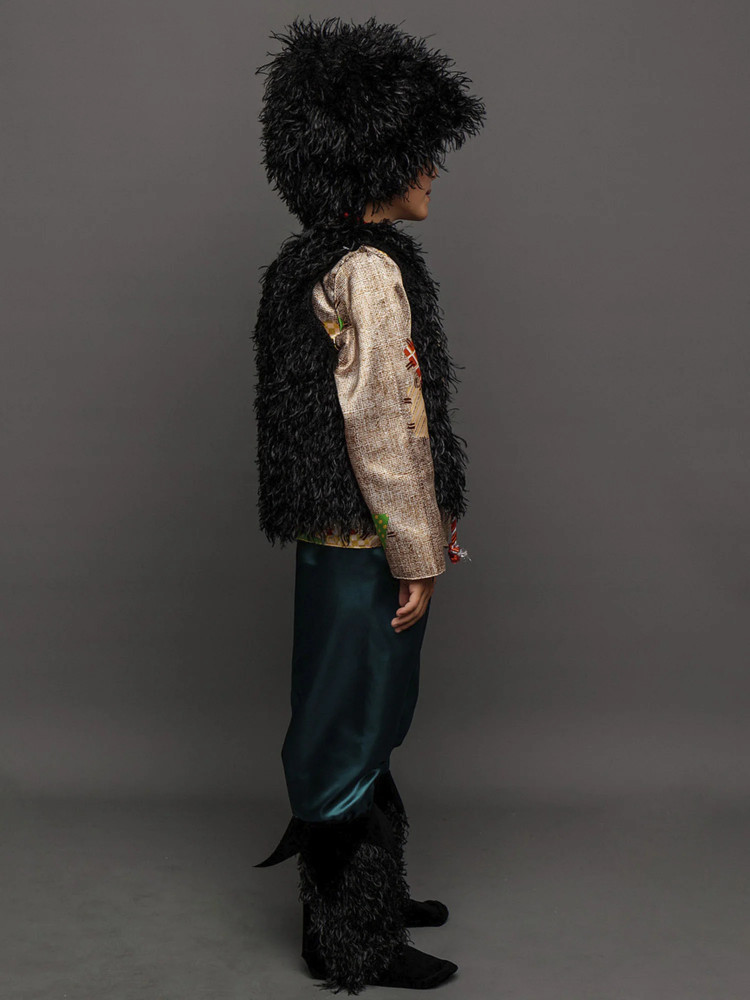 В комплект входит: рубаха, жилетка, брюки с сапогами, шапка и повязка на глаз.