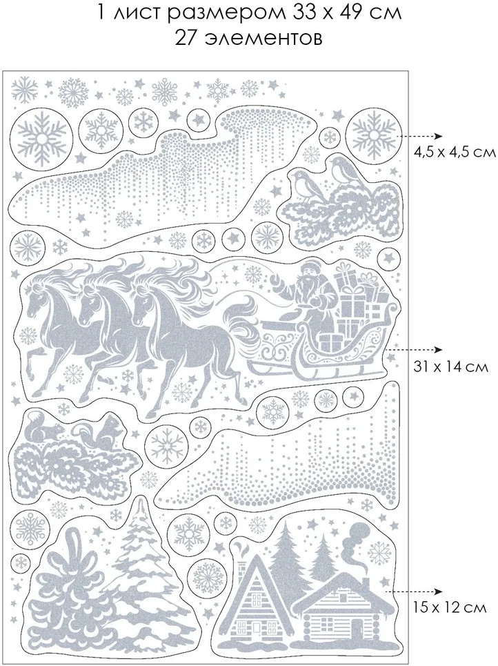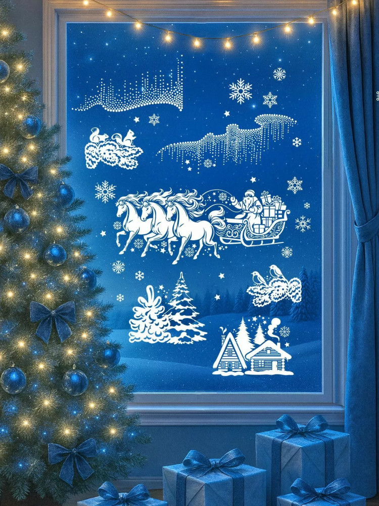 💳 Оплатить за товар можно при получении 🇰🇿 Есть бесплатная доставка по Казахстану 🎁 Копите бонусы с каждой покупки Хотите, чтобы ваш дом сразу наполнился атмосферой настоящей зимней сказки? Эти большие новогодние наклейки помогут превратить любую гладкую поверхность в волшебное полотно. На одном листе формата А3 собрано 27 элементов: от снежинок и зимних узоров до целых сюжетных композиций. Самый крупный элемент размером 31×14 см: на фоне звёздного неба мчится величественная тройка лошадей, в которой сидит Дед Мороз с мешком подарков. Наклейки на окна новогодние выполнены из прочного ПВХ и украшены пластизолью с блёстками. Такое сочетание делает их не только яркими и долговечными, но и по-настоящему праздничными. Они красиво отражают свет гирлянд и уличных фонарей, придавая интерьеру особый блеск. |