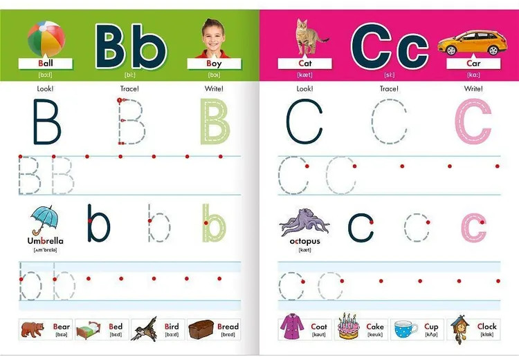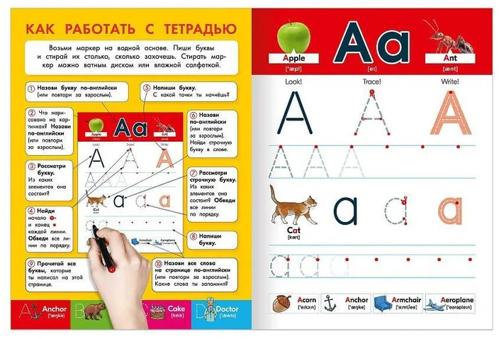 На ламинированных страницах этой тетради можно писать маркерами и фломастерами на водной основе. Маркер в комплект не входит. Они чисто стираются ватным диском или влажной салфеткой. Это позволит ребенку многократно возвращаться к красочным страницам тетради, снова и снова писать буквы и незаметно для себя всё увереннее осваивать навыки письма и запоминать слова. В данной тетради на 28 страницах представлены задания: на знакомство с буквами английского алфавита; приобретение и закрепление навыка написания букв; пополнение словарного запаса; приобретение навыка записи слов по образцу. Самостоятельно освоить написание заглавных и строчных букв ребенку помогут стрелки и другие графические подсказки. А семь английских слов с картинками, специально подобранные для каждой буквы, позволят ненавязчиво пополнить его словарный запас. Потренироваться, а затем продемонстрировать свое умение писать слова по-английски ребенок сможет на сюжетной картинке в конце тетради. Благодаря удобному формату многоразовые прописи удобно брать с собой в дорогу, путешествия.