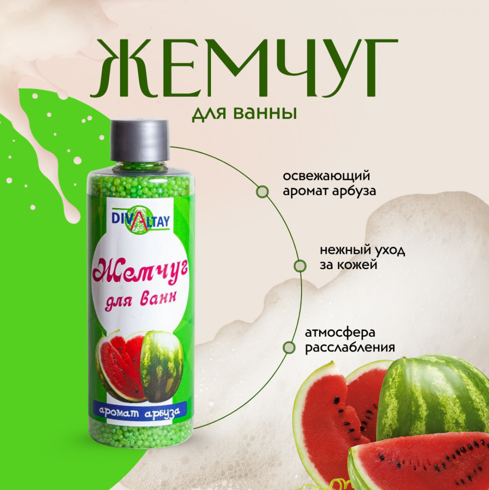 Жемчуг для ванны «Аромат арбуза» — это идеальное средство для создания атмосферы солнечного заряда энергии и витаминов в вашей ванной. Добавьте несколько столовых ложек жемчуга в теплую воду, и он растворится, наполняя ванную приятным ароматом спелой облепихи.
