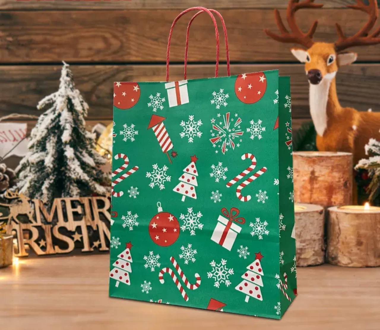 Ярко-зелёный пакет, напоминающий еловую ветку, украшен праздничными элементами: красными шарами, белыми ёлочками в горошек, карамельными тростями, подарочными коробочками, снежинками и хлопушками с искрами. Красные витые ручки делают дизайн ещё более эффектным. Плотная крафт-бумага с глянцевой печатью, усиленное дно и прочные ручки позволяют легко выдержать шампанское, конфеты, мандарины и мягкие подарки. Размер 24.5×30.5×10 см — универсальный, подходит для игрушек, свитеров, косметики, книг, гаджетов или сладостей, превращая любой подарок в яркое праздничное впечатление.
