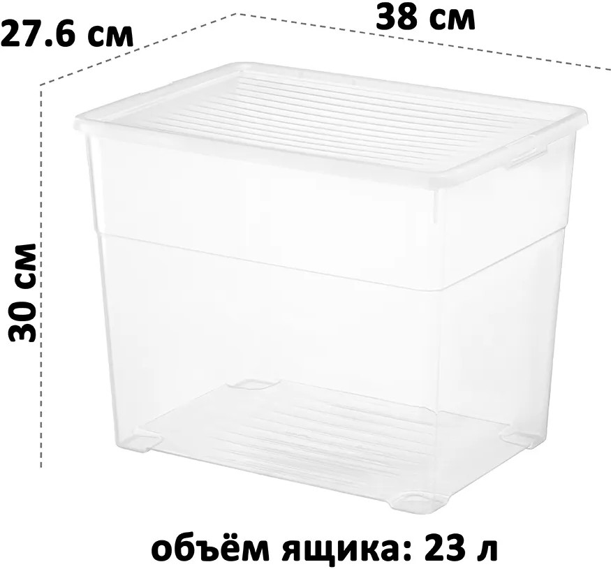 Универсальный ящик от El Casa предназначен для организации хранения вещей дома, в офисе и на даче. Подходит для эстетичного хранения на стеллаже. Размер коробки — 38×27.6×30 см, объём ёмкости — 23 литра. Размер дна — 32.5×22.5 см. Размер без крышки — 38×27×30 см. Крышка фиксируется за счёт 2 прямоугольных отверстий по бокам, которые надеваются на небольшие выступы на контейнере. Органайзер изготовлен из прочного пищевого пластика — полипропилена, который не содержит бисфенол А и другие вредные вещества. Он не впитывает посторонние ароматы и устойчив к влаге, благодаря чему обеспечит сохранность любого содержимого. Благодаря прозрачным стенкам вы сможете легко следить за наполнением.