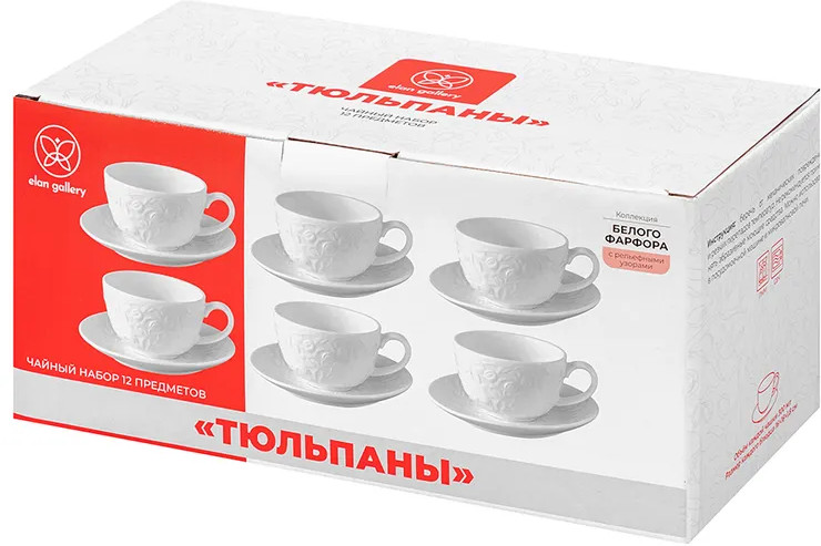 💳 Оплатить за товар можно при получении 🇰🇿 Есть бесплатная доставка по Казахстану 🎁 Копите бонусы с каждой покупки Серия: Тюльпаны Чайный набор Elan Gallery «Тюльпаны» состоит из 12 предметов. Выполнен из белого фарфора и украшен изящными рельефными узорами с цветами. Можно использовать как кофейный или для сервировки любых других напитков. В состав набора входят 6 чашек объёмом 300 мл и размером 13×10×6.5 см каждая, 6 блюдец размерами 16×16×2 см. Фарфоровый набор на шесть персон подходит для любителей чая и кофе. Вы сможете насладиться любимыми напитками из красивой кружки и удивить своих гостей. Используйте блюдце как подставку под чашку. Положите на тарелочку кусочек торта, домашнего пирога или пирожное. Сервировочная тарелка подойдёт не только для десерта, но и закусок: сырной нарезки, сырокопчёной колбасы или свежих овощей и зелени. |