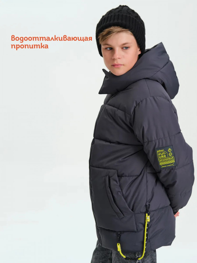 Капюшон регулируется по высоте утяжками, а по низу изделия предусмотрена внутренняя регулировка ширины, чтобы подстроить посадку под фигуру и лучше защититься от ветра. Съёмный декор на карабине добавляет стильный акцент и понравится детям. Прямой силуэт с умеренным объёмом и мягкой линией плеча выглядит современно и подходит ребятам с разными типами фигуры.