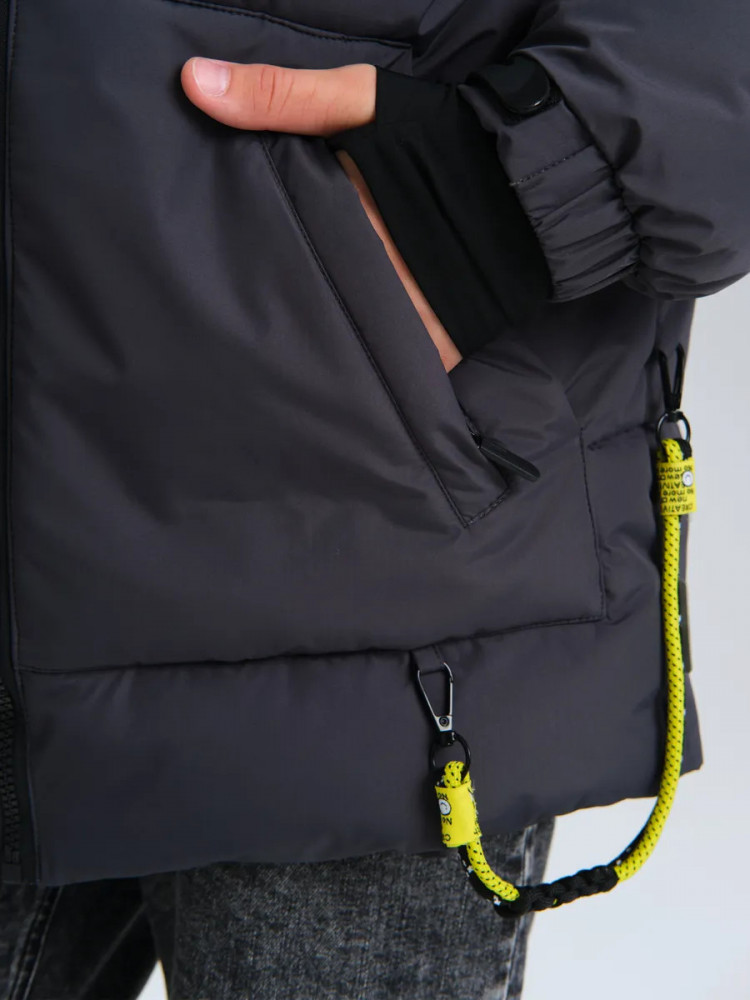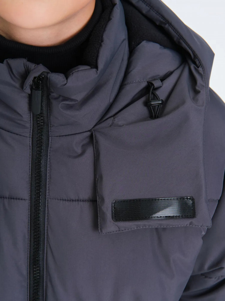 Капюшон регулируется по высоте утяжками, а по низу изделия предусмотрена внутренняя регулировка ширины, чтобы подстроить посадку под фигуру и лучше защититься от ветра. Съёмный декор на карабине добавляет стильный акцент и понравится детям. Прямой силуэт с умеренным объёмом и мягкой линией плеча выглядит современно и подходит ребятам с разными типами фигуры.