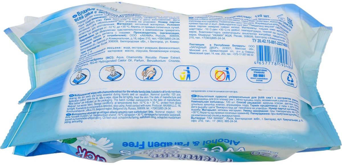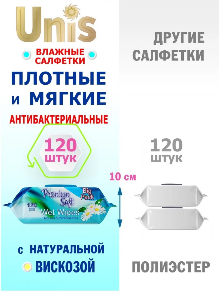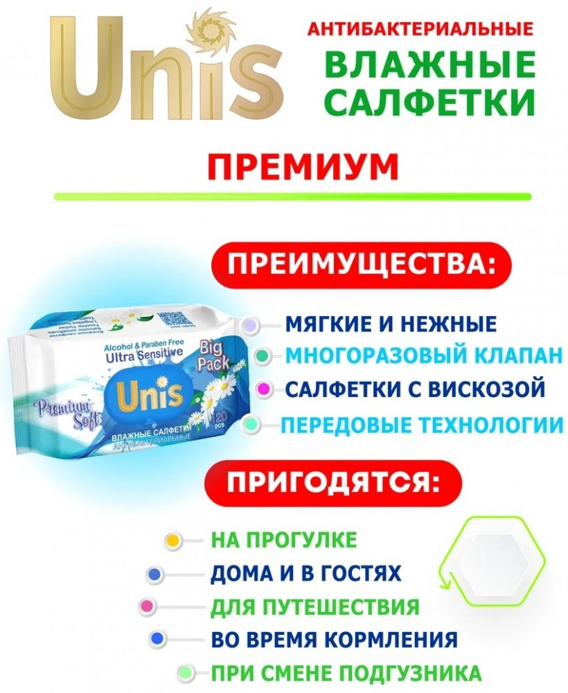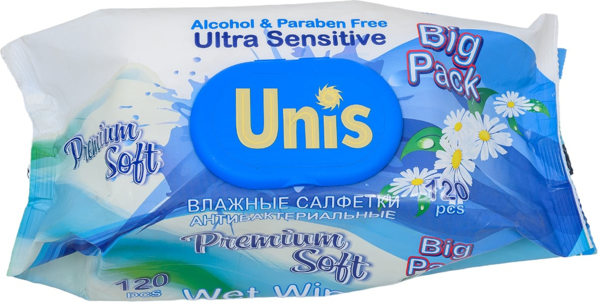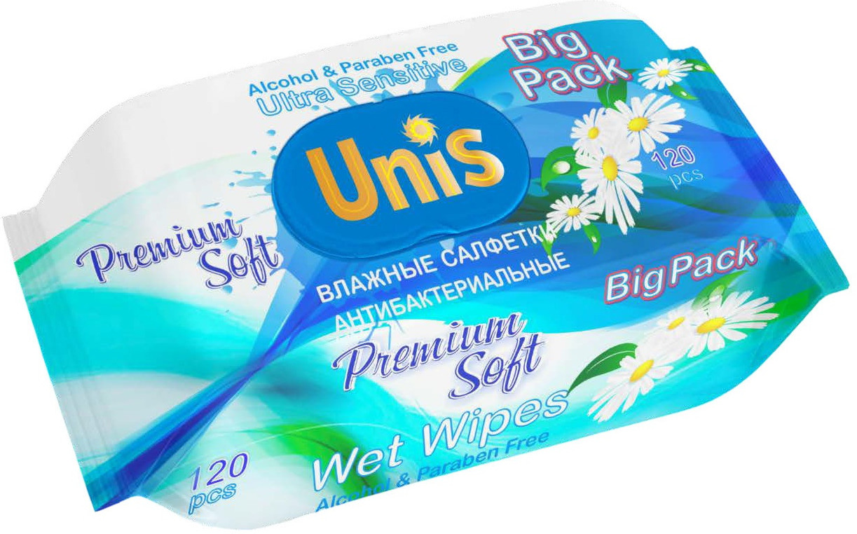Unis Салфетки влажные антибактериальные универсальные для всей семьи с экстрактом ромашки