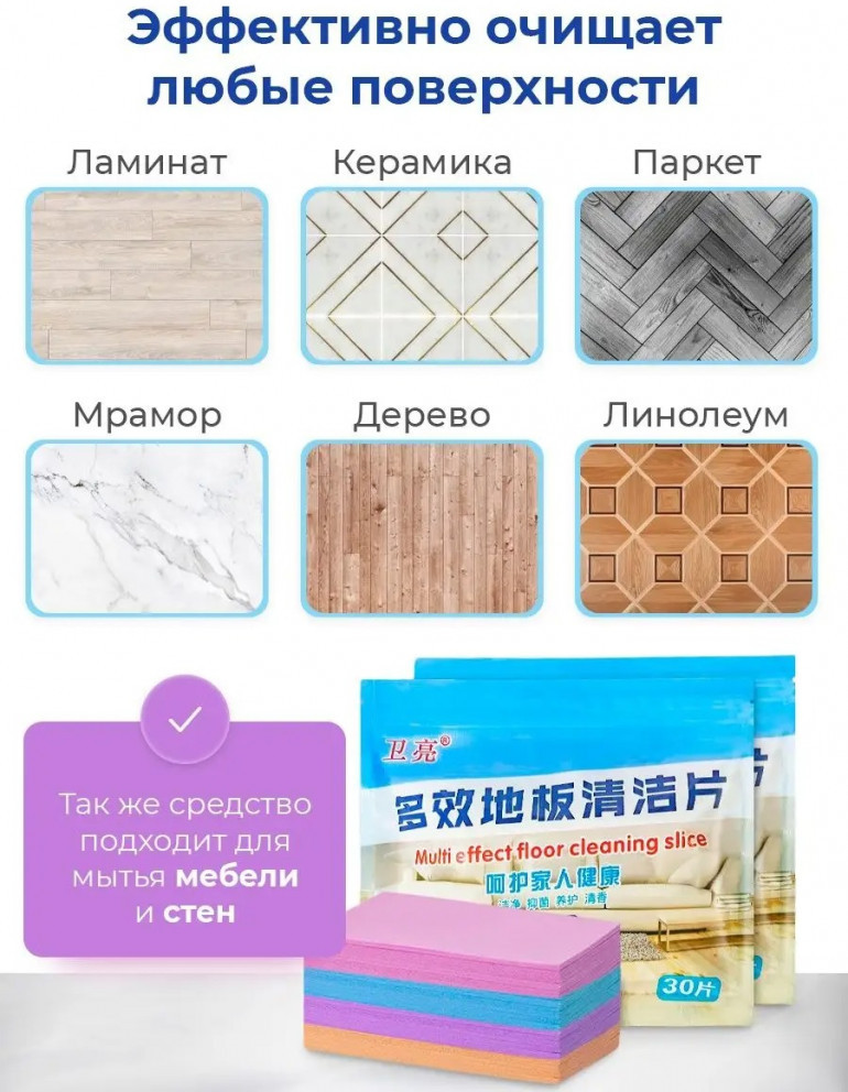💳 Оплатить за товар можно при получении 🇰🇿 Есть бесплатная доставка по Казахстану 🎁 Копите бонусы с каждой покупки Пластины голубого цвета, растворимые для мытья пола. Супер компактное и лёгкое, заменяющее тяжёлые, объемные упаковки с домашней жидкой химией. Универсальное моющее средство для уборки и мытья полов в упаковке 30г заменит Вам большие бутылки и пакеты. Эта небольшая упаковка помогает экономить - средства хватит на 30 циклов уборки. Не оставляет разводов и следов. Не раздражает и не сушит кожу рук. Пластины для мытья полов легко помещаются на полку и не занимают много места. Средство подходит для ежедневного ухода за любыми моющимися поверхностями. Можно использовать для мойки всех типов полов. Концентрированное моющее средство подходит для синтетических и виниловых покрытий, поверхностей из линолеума, дерева, паркета, ламината, асфальта, бетона, облицовочной плитки, стекла, гранита и мрамора. Сухое средство для уборки удаляет жировые загрязнения растительного и животного происхождения, нейтрализует запахи. Средство практически без запаха – присутствует еле уловимый антибактериальный запах. |