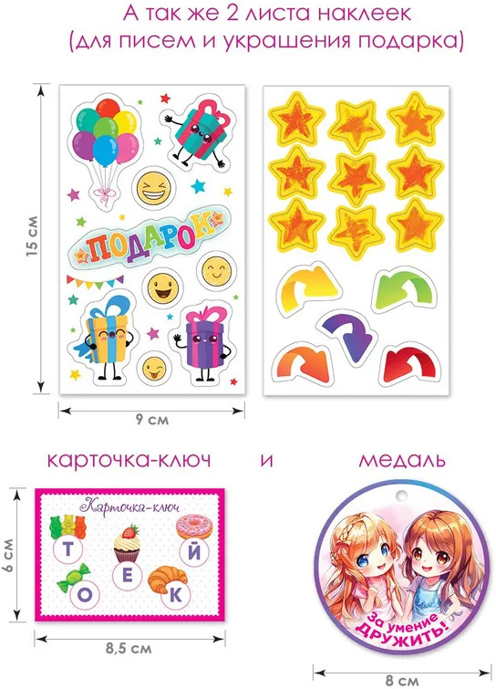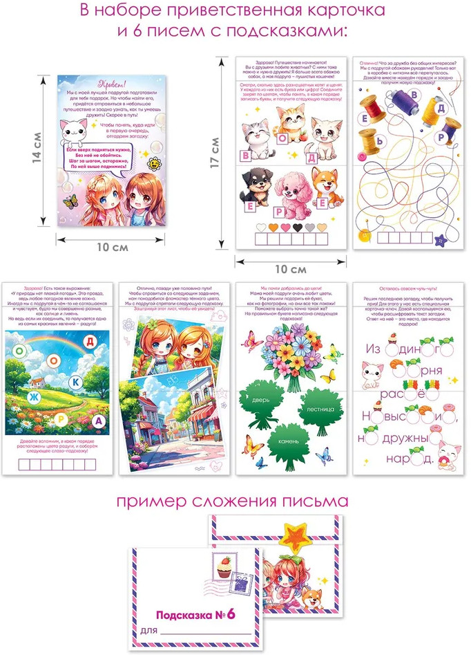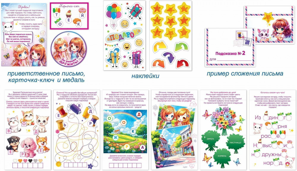 💳 Оплатить за товар можно при получении 🇰🇿 Есть бесплатная доставка по Казахстану 🎁 Копите бонусы с каждой покупки Увлекательные игры в формате квеста — это отличная идея для детского времяпрепровождения! Тематические задания, загадки и головоломки нужно решать последовательно, чтобы в конце оказаться у заветного подарка. Совершайте захватывающие путешествия, не выходя из дома или двора! Детский квест «Лучшие подружки» — это настоящее путешествие в сказочную страну! Будет совсем не страшно и очень увлекательно! Главные героини этого набора — две подруги, которые проведут детей к подарку, рассказывая по дороге о том, какой бывает настоящая дружба. |