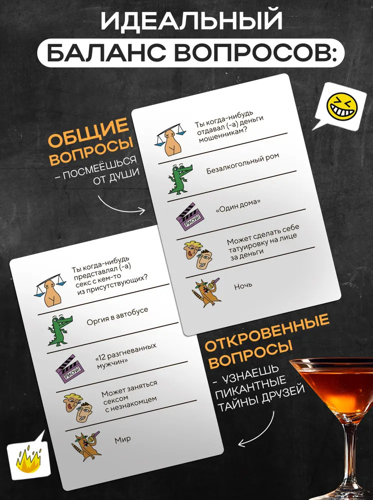 💳 Оплатить за товар можно при получении 🇰🇿 Есть бесплатная доставка по Казахстану 🎁 Копите бонусы с каждой покупки «VPISKA» — это алкогольная игра для взрослых, которая превратит ваш вечер в череду невероятных, пикантных и безумно веселых моментов. 5 типов заданий, 350 вопросов и вызовов! От «Голой правды» до караоке-бара — каждый раунд игры будет непредсказуемым. Вы никогда не знаете, что ждет вас в следующей карте: придется ли признаваться в чем-то пикантном, рисовать фильмы или вспоминать хиты 2000-х. |