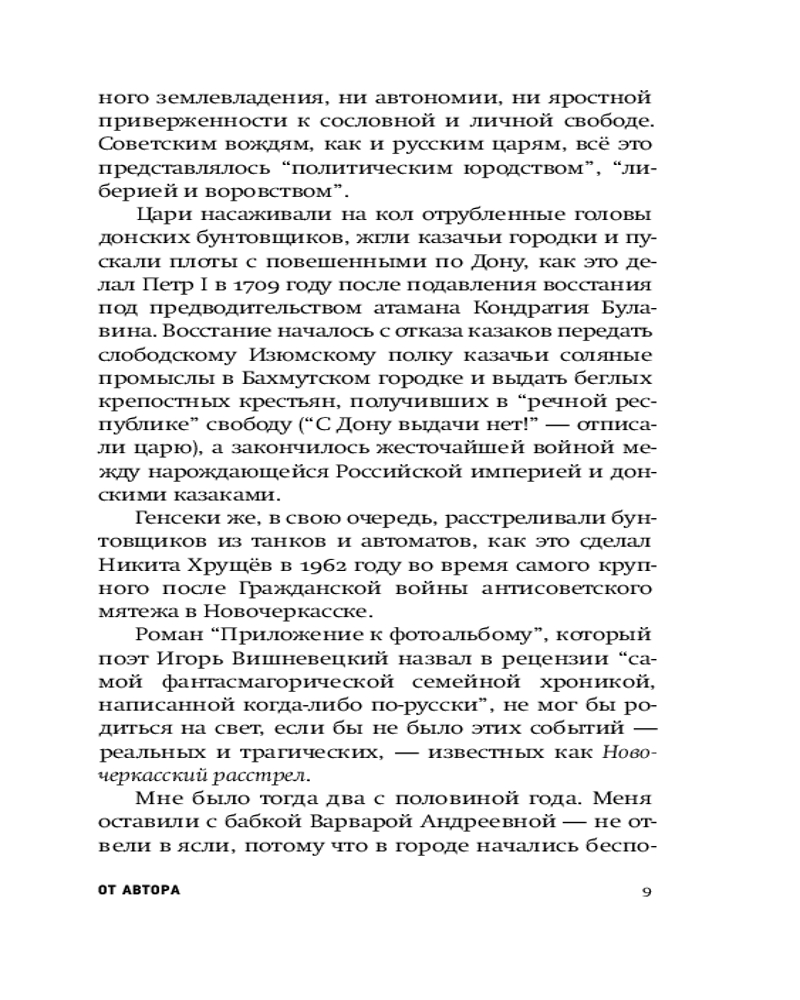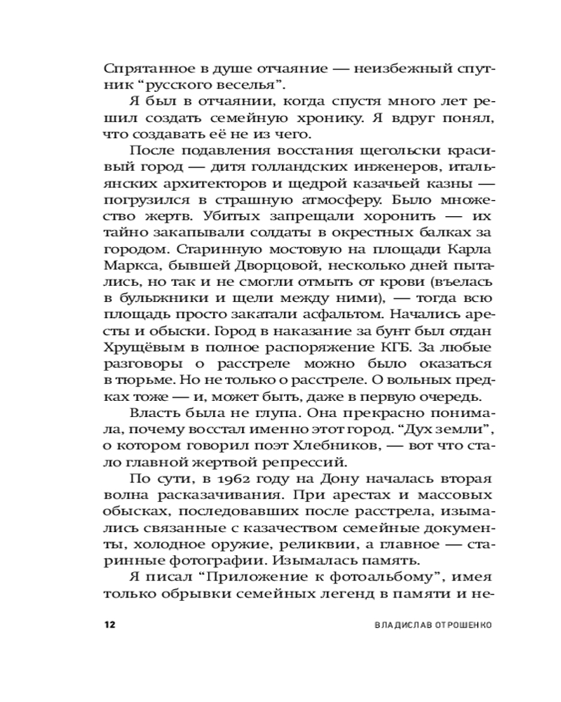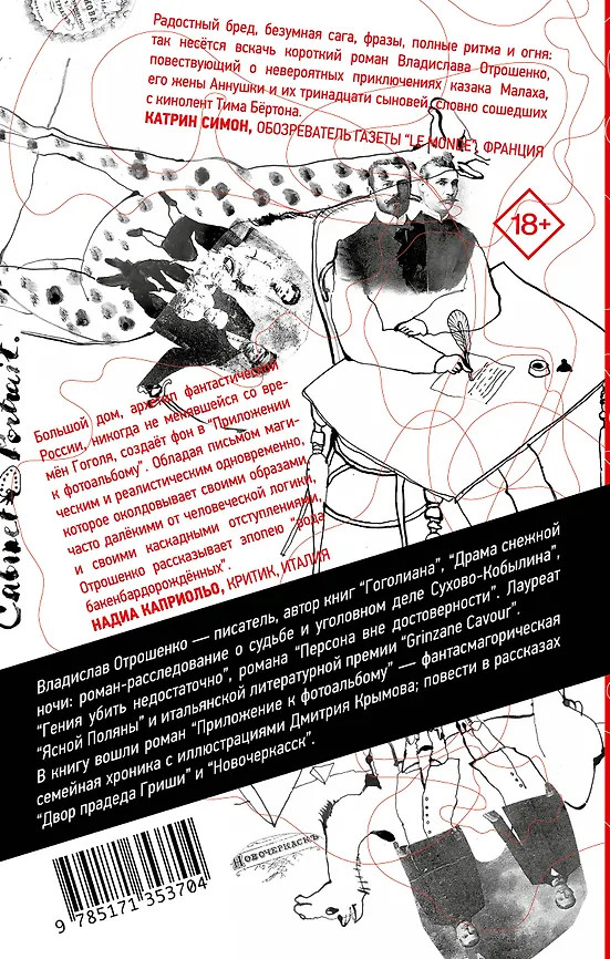 💳 Оплатить за товар можно при получении 🇰🇿 Есть бесплатная доставка по Казахстану 🎁 Копите бонусы с каждой покупки Серия: Совсем другое время Владислав Отрошенко — писатель, автор книг «Гоголиана», «Драма снежной ночи: роман-расследование о судьбе и уголовном деле Сухово-Кобылина», «Гения убить недостаточно», романа «Персона вне достоверности». Лауреат «Ясной Поляны» и итальянской литературной премии Grinzane Cavour. В книгу вошли роман «Приложение к фотоальбому» — фантасмагорическая семейная хроника с иллюстрациями Дмитрия Крымова и повести в рассказах «Двор прадеда Гриши» и «Новочеркасск». |