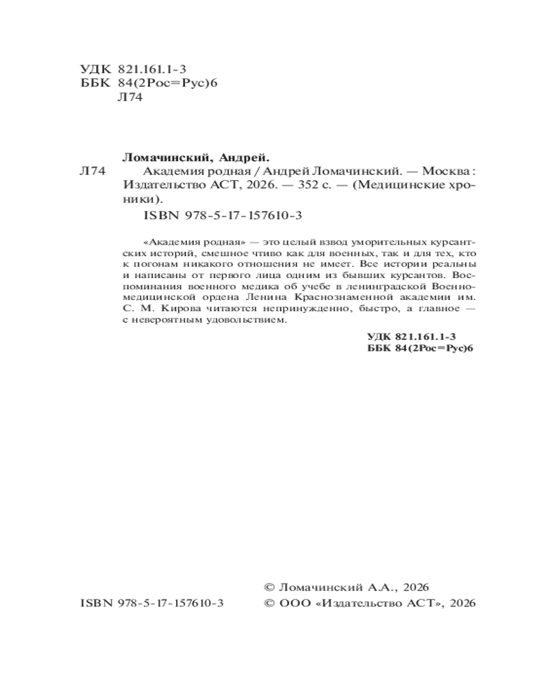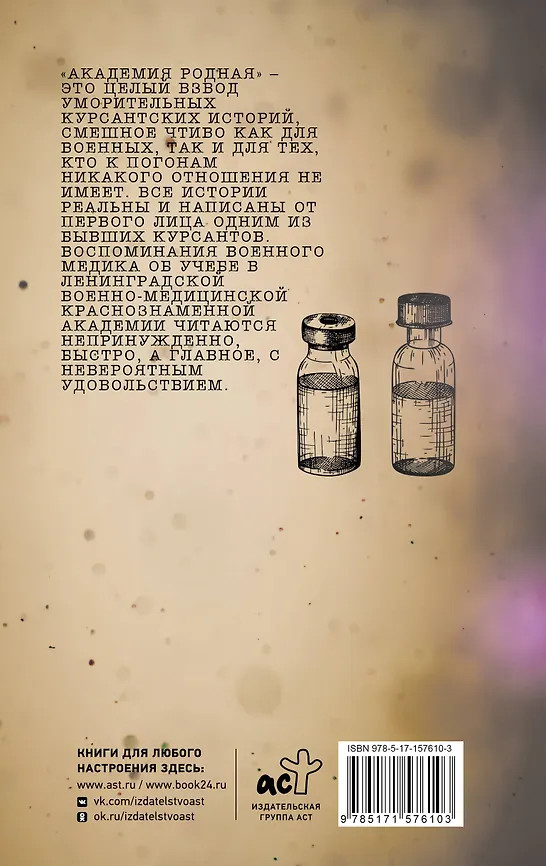 💳 Оплатить за товар можно при получении 🇰🇿 Есть бесплатная доставка по Казахстану 🎁 Копите бонусы с каждой покупки Серия: Медицинские хроники «Академия родная» — это целый взвод уморительных курсантских историй, смешное чтиво как для военных, так и для тех, кто к погонам никакого отношения не имеет. Все истории реальны и написаны от первого лица одним из бывших курсантов. Воспоминания военного медика об учебе в ленинградской Военно-медицинской ордена Ленина Краснознаменной академии им. С. М. Кирова читаются непринужденно, быстро, а главное — с невероятным удовольствием. |