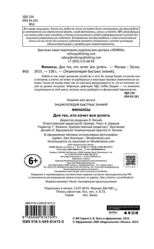 Финансы. Для тех, кто хочет все успетьВ данный момент этот товар отсутствует в продаже. Возможно, у нас найдется аналогичный или похожий товар здесь. Серия: Энциклопедия быстрых знаний Любой из нас ведет домашнее хозяйство и хотя бы иногда бывает на рынке или в магазине, а значит, не может не разбираться в некоторых базовых экономических законах, только не всегда знает, как |