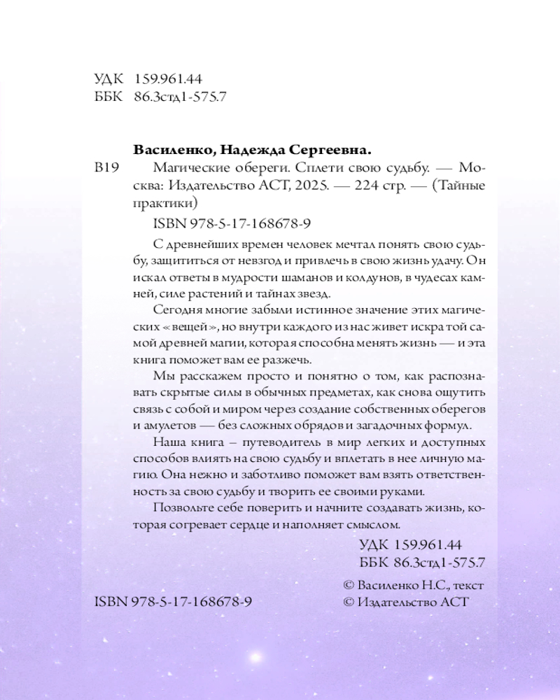 💳 Оплатить за товар можно при получении 🇰🇿 Есть бесплатная доставка по Казахстану 🎁 Копите бонусы с каждой покупки Серия: Тайные практики С древнейших времен человек мечтал понять свою судьбу, защититься от невзгод и привлечь в свою жизнь удачу. Он искал ответы в мудрости шаманов и колдунов, в чудесах камней, силе растений и тайнах звезд. Сегодня многие забыли истинное значение этих магических «вещей», но внутри каждого из нас живет искра той самой древней магии, которая способна менять жизнь — и эта книга поможет вам ее разжечь. Мы расскажем просто и понятно о том, как распознавать скрытые силы в обычных предметах, как снова ощутить связь с собой и миром через создание собственных оберегов и амулетов — без сложных обрядов и загадочных формул. |