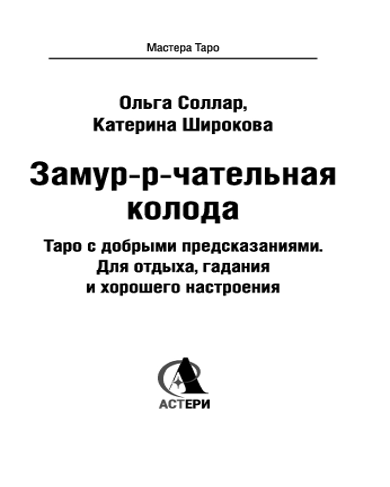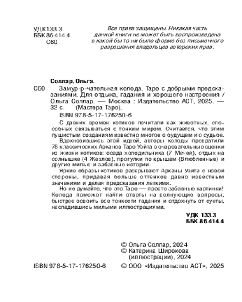 💳 Оплатить за товар можно при получении 🇰🇿 Есть бесплатная доставка по Казахстану 🎁 Копите бонусы с каждой покупки Серия: Мастера Таро (Коробка с картами + руководство) Эта колода умиляет, вдохновляет и... предсказывает будущее! Автор Ольга Соллар и художница Екатерина Широкова превратили 78 классических Арканов Таро Уэйта в очаровательные сценки из жизни котиков. Здесь есть хулиганы, философы, лентяи и храбрецы — каждый Аркан раскрывается через их приключения и дает гадающему ответ на вопрос. Вместо образов людей из колоды Уэйта здесь вас ждут пушистые герои: котенок, выпавший из корзины, на Аркане Шут; кот, тянущий колбасу из рук хозяйки, на Аркане Сила; удачливый хвостик, заглядывающий в аквариум к семье рыбок, на 10 Кубков и многие другие. |