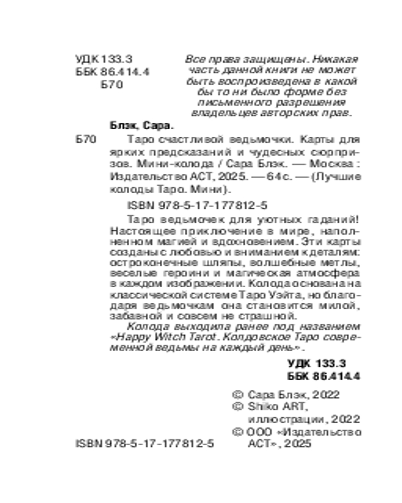 💳 Оплатить за товар можно при получении 🇰🇿 Есть бесплатная доставка по Казахстану 🎁 Копите бонусы с каждой покупки Серия: Лучшие колоды Таро. Мини Яркая колода Таро с ведьмочками — это не просто инструмент для гадания, а настоящее приключение в мире, наполненном магией и вдохновением. Эти карты созданы с любовью и вниманием к деталям: остроконечные шляпы, волшебные метлы, веселые героини и магическая атмосфера в каждом изображении. Колода предназначена для тех, кто ищет глубокое понимание себя и окружающего мира через призму магии и интуиции. Красочные иллюстрации помогают установить связь с подсознанием, раскрыть скрытые смыслы и получить ответы на важные вопросы о любви, карьере и духовном развитии. Каждая карта обладает уникальной светлой энергетикой и символикой, что делает гадание вдохновляющим процессом. |