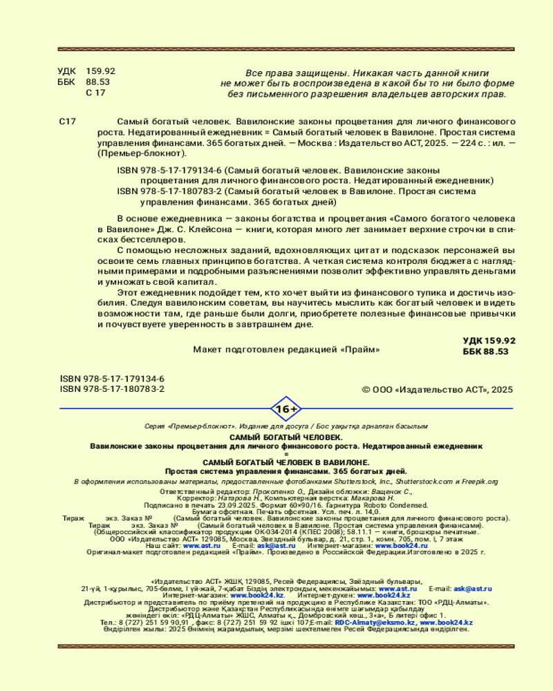 В данный момент этот товар отсутствует в продаже. Возможно, у нас найдется аналогичный или похожий товар здесь. Серия: Премьер-блокнот На основе мирового бестселлера Дж. С. Клейсона «Самый богатый человек в Вавилоне»! Цветной недатированный финансовый ежедневник поможет управлять деньгами, избавиться от хаоса в бюджете, выйти из финансового тупика, выработать привычки состоятельного человека и разбогатеть. Описанные в нем древние законы богатства адаптированы к жизни современного человека — их легко применять. Без скучной теории и расчетов — не нужно обладать специальными знаниями в математике или финансах.