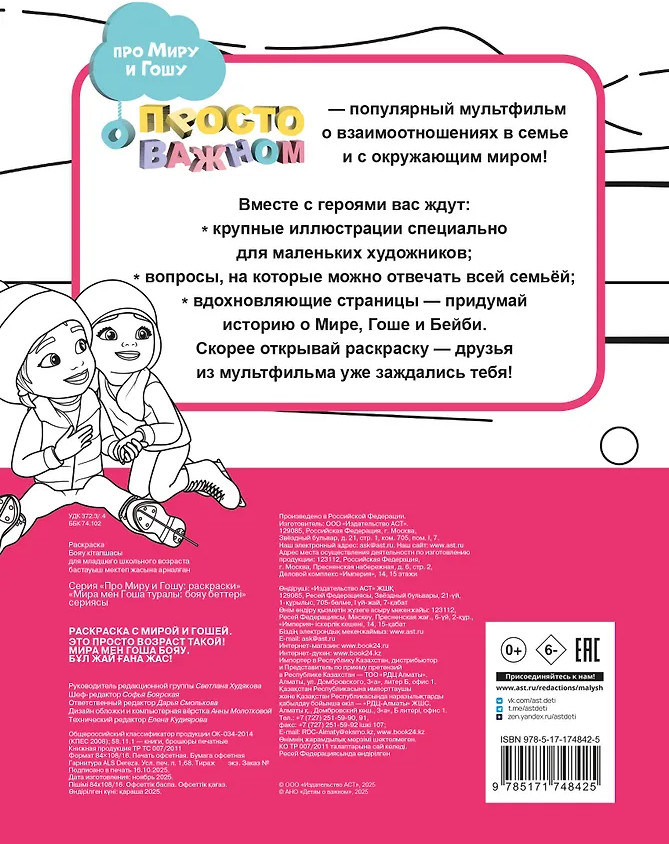 💳 Оплатить за товар можно при получении 🇰🇿 Есть бесплатная доставка по Казахстану 🎁 Копите бонусы с каждой покупки Серия: Про Миру и Гошу: раскраски «Просто о важном» — популярный мультфильм о взаимоотношениях в семье и с окружающим миром! Вместе с героями вас ждут: |