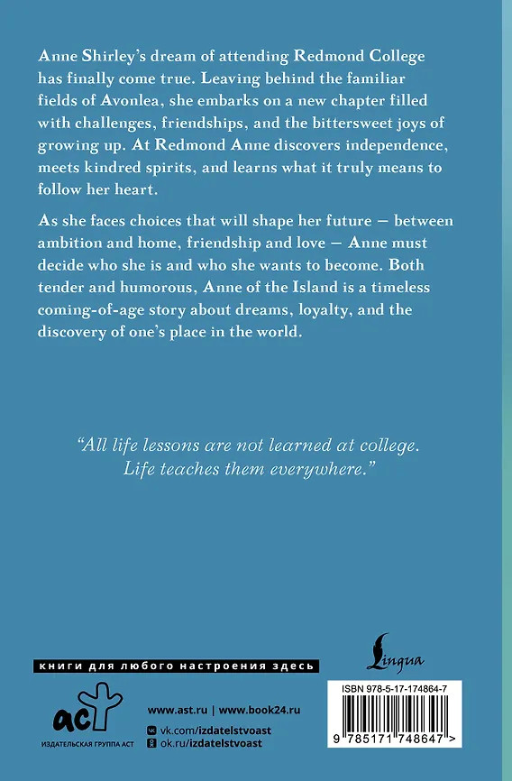 💳 Оплатить за товар можно при получении 🇰🇿 Есть бесплатная доставка по Казахстану 🎁 Копите бонусы с каждой покупки Серия: Exclusive Classics Hardcover Энн Ширли покидает Авонлею, чтобы начать учёбу в Редмондском университете. Впереди её ждут новые друзья, неожиданные испытания, радости и открытия. Она взрослеет, ищет своё место в мире, учится отличать мимолётные увлечения от настоящего чувства и понимать, чего хочет её сердце. Но при всех переменах Энн остаётся самой собой — искренней, мечтательной и удивительно верной своим идеалам. Её история полна света, тепла и тихой мудрости, которая помогает верить в любовь и силу дружбы. |