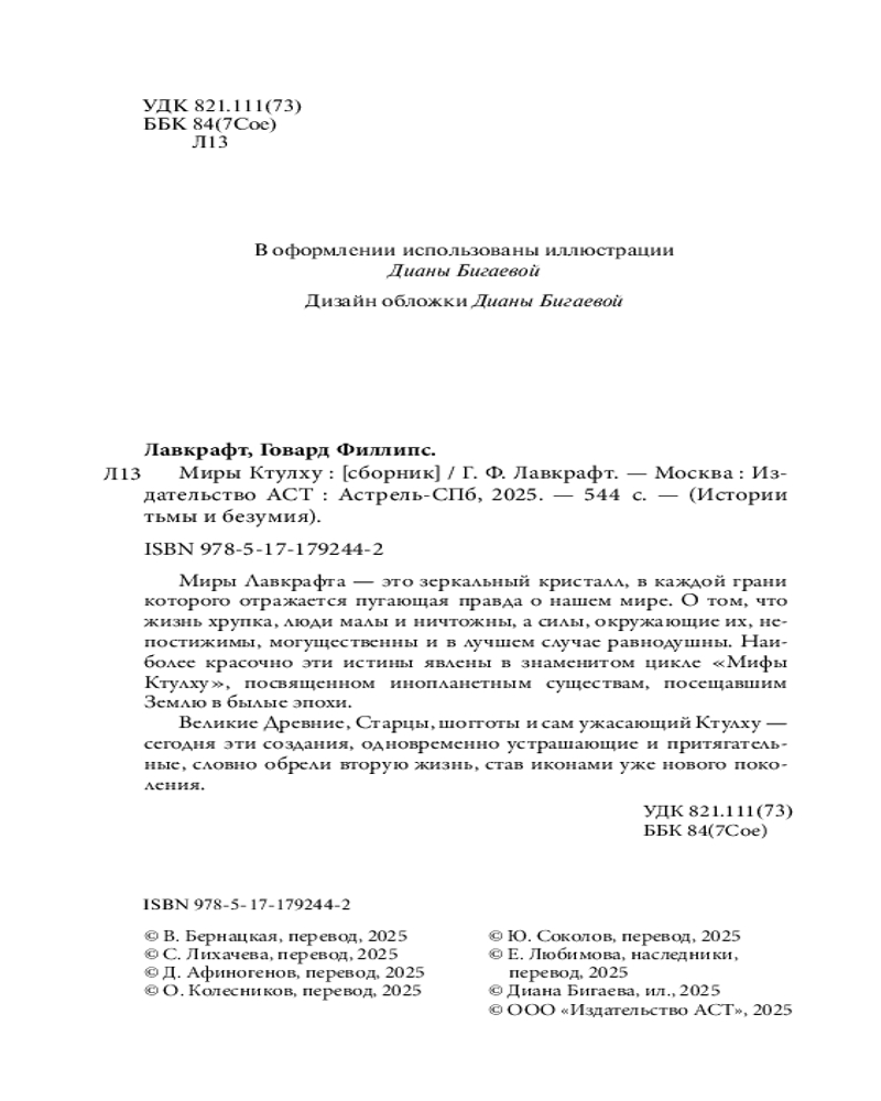 💳 Оплатить за товар можно при получении 🇰🇿 Есть бесплатная доставка по Казахстану 🎁 Копите бонусы с каждой покупки Серия: Истории тьмы и безумия Миры Лавкрафта — это зеркальный кристалл, в каждой грани которого отражается пугающая правда о нашем мире. О том, что жизнь хрупка, люди малы и ничтожны, а силы, окружающие их, непостижимы, могущественны и в лучшем случае равнодушны. Наиболее красочно эти истины явлены в знаменитом цикле «Мифы Ктулху», посвященном инопланетным существам, посещавшим Землю в былые эпохи. Великие Древние, Старцы, шогготы и сам ужасающий Ктулху — сегодня эти создания, одновременно устрашающие и притягательные, словно обрели вторую жизнь, став иконами уже нового поколения. |