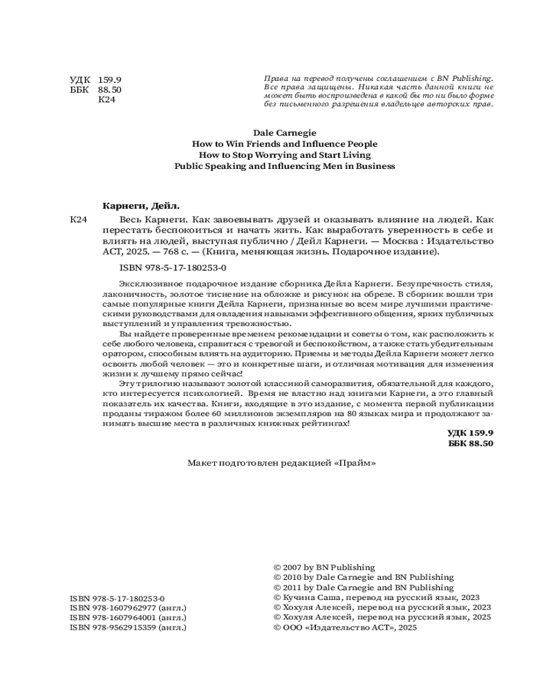 💳 Оплатить за товар можно при получении 🇰🇿 Есть бесплатная доставка по Казахстану 🎁 Копите бонусы с каждой покупки Серия: Книга, меняющая жизнь. Подарочное издание Эксклюзивное издание сборника Дейла Карнеги с цветным обрезом станет прекрасным подарком и украшением домашней библиотеки. Издание включает в себя три самые популярные книги Дейла Карнеги, признанные во всем мире лучшими практическими руководствами для овладения навыками эффективного общения, ярких публичных выступлений и управления тревожностью. Методики Карнеги остаются актуальными и пользуются популярностью у читателей и по сей день. |