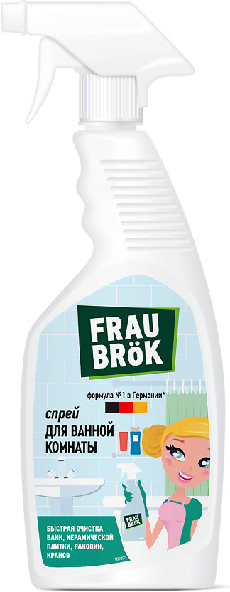 Привет, я — фрау Брок! И я в уборке знаю толк. Чистая ванна — это так приятно! Но тратить время на уборку совсем не хочется? Не беда — спрей для ванной комнаты Frau Brök справится со всеми загрязнениями за несколько минут! Его безопасная формула без хлора с добавлением эффективных немецких компонентов легко и быстро удаляет мыльный, известковый налет и ржавчину с ванны, унитаза, душевых кабин, плитки и сантехники, возвращая кристальную белизну. Frau Brök — и уборка в удовольствие!