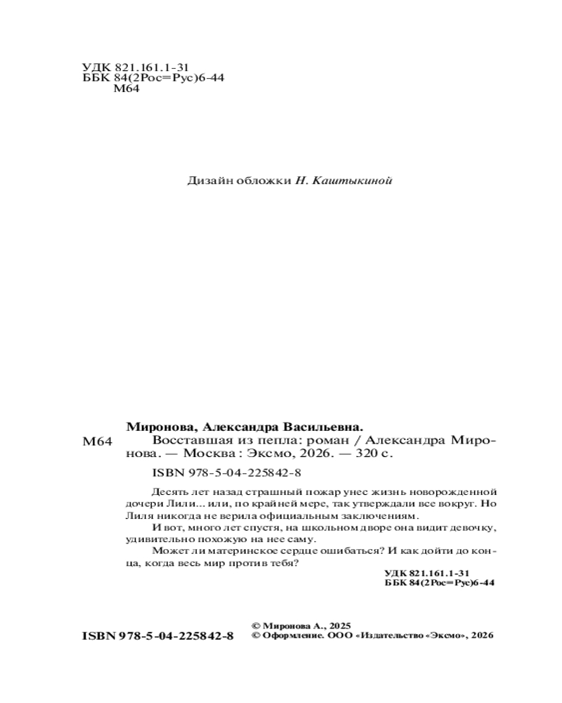 💳 Оплатить за товар можно при получении 🇰🇿 Есть бесплатная доставка по Казахстану 🎁 Копите бонусы с каждой покупки Серия: Вслед за мечтой. Романы А. Мироновой Десять лет назад страшный пожар унес жизнь новорожденной дочери Лили... Или, по крайней мере, так утверждали все вокруг. Но Лиля никогда не верила официальным заключениям. И вот много лет спустя на школьном дворе она видит девочку, удивительно похожую на нее саму. Может ли материнское сердце ошибаться? И как дойти до конца, когда весь мир против тебя? |