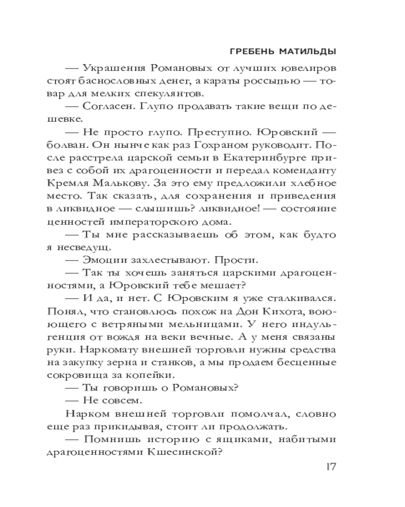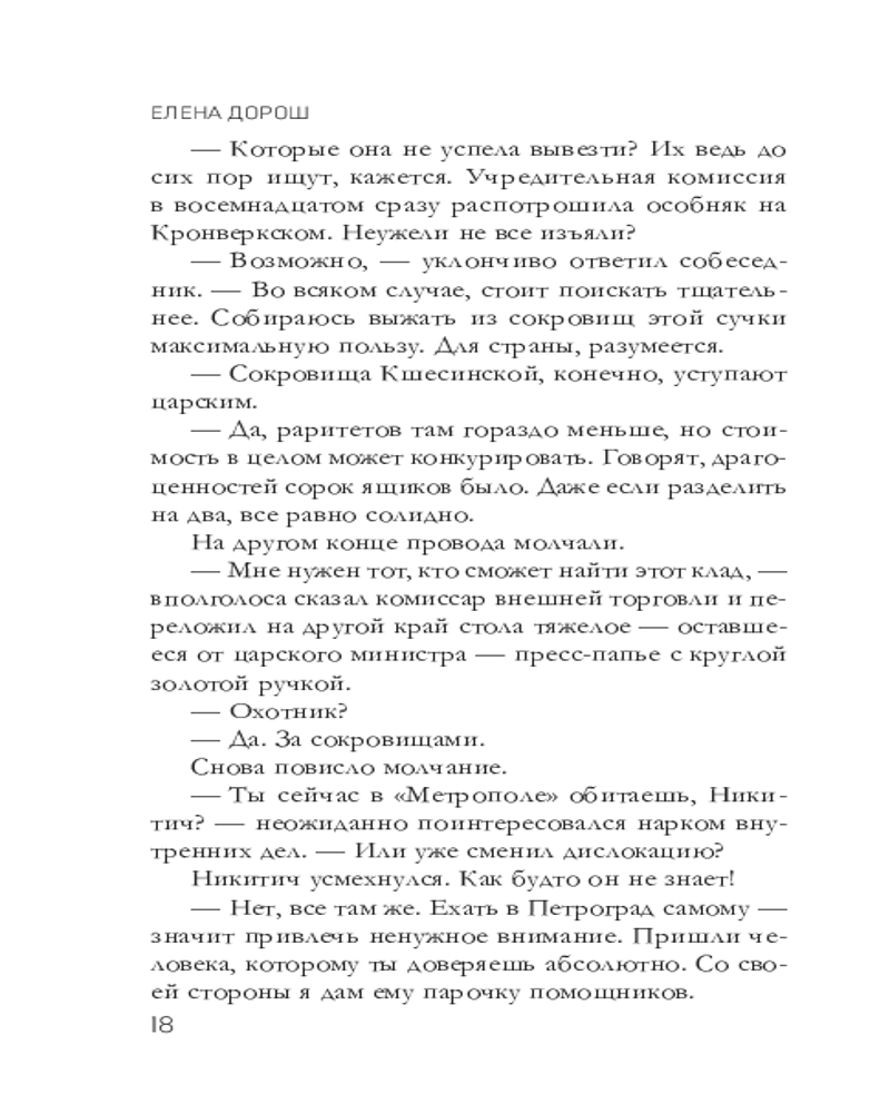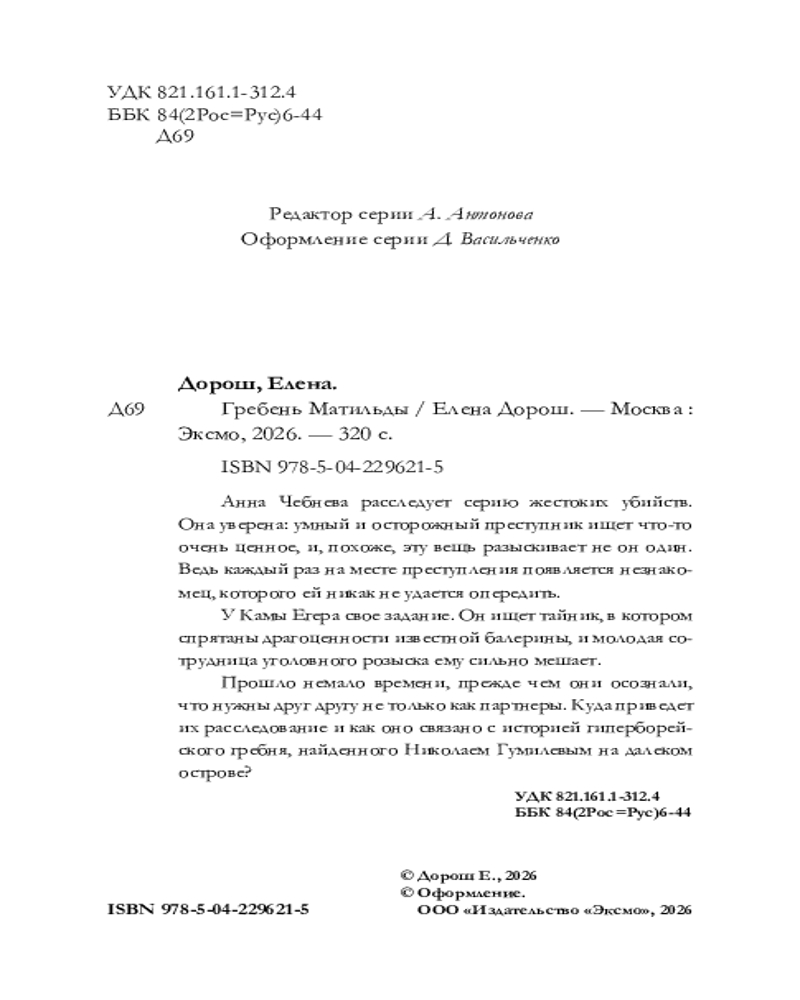 💳 Оплатить за товар можно при получении 🇰🇿 Есть бесплатная доставка по Казахстану 🎁 Копите бонусы с каждой покупки Серия: Вечерний детектив Елены Дорош. Новое оформление (обложка) Анна Чебнева расследует серию жестоких убийств. Она уверена: умный и осторожный преступник ищет что-то очень ценное, и, похоже, эту вещь разыскивает не он один. Ведь каждый раз на месте преступления появляется незнакомец, которого ей никак не удается опередить. У Камы Егера свое задание. Он ищет тайник, в котором спрятаны драгоценности известной балерины, и молодая сотрудница уголовного розыска ему сильно мешает. Прошло немало времени, прежде чем они осознали, что нужны друг другу не только как партнеры. Куда приведет их расследование и как оно связано с историей гиперборейского гребня, найденного Николаем Гумилевым на далеком острове? |