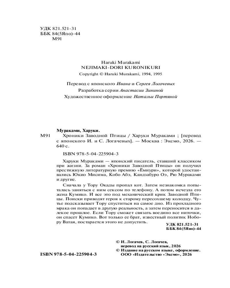 💳 Оплатить за товар можно при получении 🇰🇿 Есть бесплатная доставка по Казахстану 🎁 Копите бонусы с каждой покупки Серия: Магистраль. Коллекция Сначала у Тору Окады пропал кот. Затем незнакомка попыталась заняться с ним сексом по телефону. А потом исчезла его жена Кумико. И всё это под механический крик Заводной Птицы. Поиски приводят героя к старому пересохшему колодцу. Чутье подсказывает Тору спуститься на самое дно. Из прохладного мрака он попадает в другую реальность, а затем переносится в далекое прошлое. Если Тору сможет связать воедино все ниточки, он спасет Кумико. Вот только ее брат, известный политик Нобору Ватая, постарается этого не допустить. |