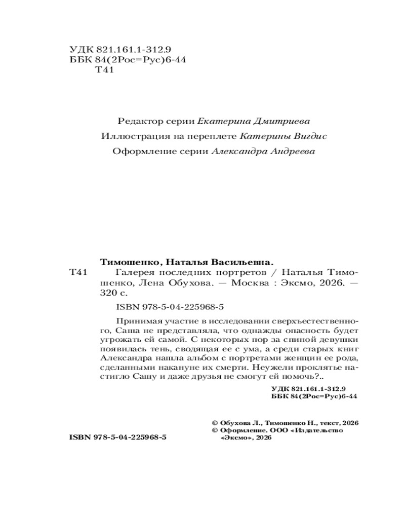 💳 Оплатить за товар можно при получении 🇰🇿 Есть бесплатная доставка по Казахстану 🎁 Копите бонусы с каждой покупки Серия: Секретное досье. Мистические романы. Новое оформление Принимая участие в исследовании сверхъестественного, Саша не представляла, что однажды опасность будет угрожать ей самой. С некоторых пор за спиной девушки появилась тень, сводящая ее с ума, а среди старых книг Александра нашла альбом с портретами женщин ее рода, сделанными накануне их смерти. Неужели проклятье настигло Сашу и даже друзья не смогут ей помочь?.. |