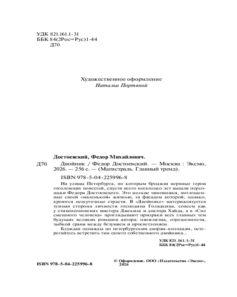 💳 Оплатить за товар можно при получении 🇰🇿 Есть бесплатная доставка по Казахстану 🎁 Копите бонусы с каждой покупки Серия: Магистраль. Главный тренд На улицы Петербурга, по которым бродили нервные герои гоголевских повестей, спустя всего несколько лет вышли персонажи Федора Достоевского. Это мелкие чиновники, поглощенные своей «маленькой» жизнью, за фасадом которой, однако, кроются нешуточные страсти. В «Двойнике» материализуется темная сторона личности господина Голядкина, совсем как у стивенсоновских мистера Джекила и доктора Хайда, а в «Сне смешного человека» проглядывают призраки всех главных тем будущих великих романов автора: нигилизма, отрешенности, зыбкой грани между безумием и просветлением. Блуждая однажды по петербургским дворам-колодцам, остерегайтесь встретить там своего собственного двойника... |