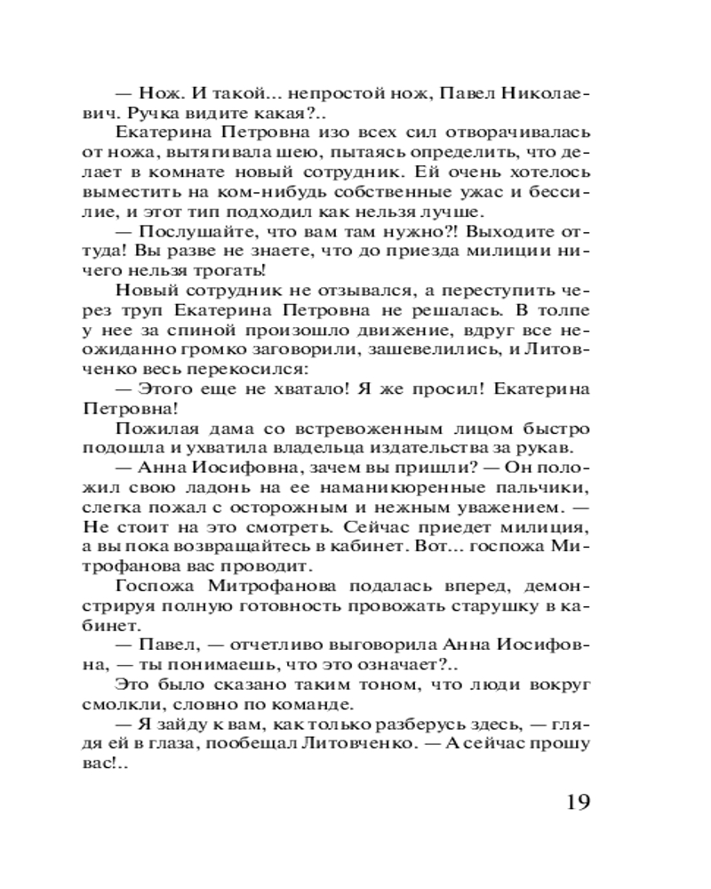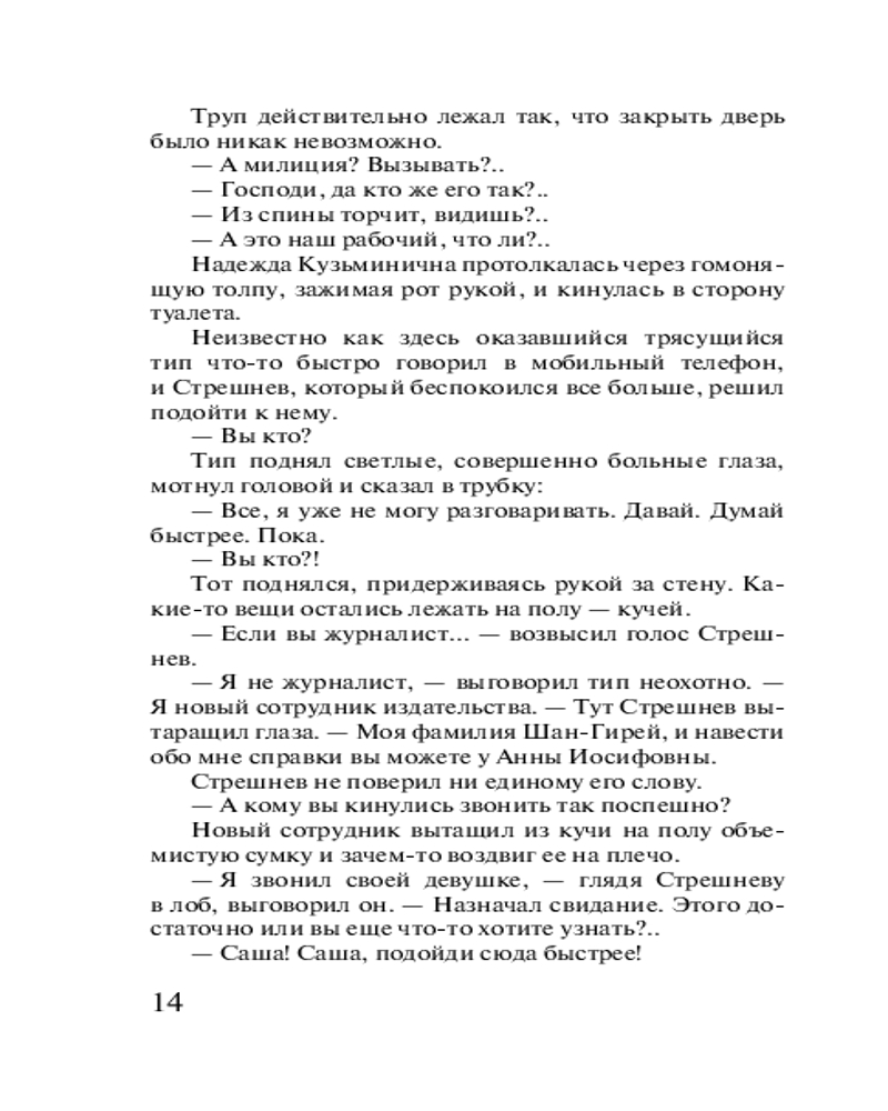 💳 Оплатить за товар можно при получении 🇰🇿 Есть бесплатная доставка по Казахстану 🎁 Копите бонусы с каждой покупки Серия: Столичный детектив. Новое оформление (обложка) Он ведет странную жизнь и, кажется, не слишком ею доволен. У него странная профессия, странные привычки, даже имя странное — Алекс Шан-Гирей!.. Издательство, в которое Алекса пригласили на работу, на первый взгляд кажется вполне мирным, уютным и процветающим. Все друг друга любят и заняты благородным делом — изданием книг. Всё пойдет прахом как раз в тот день, когда в коридоре издательства обнаружится труп. Кто этот человек? Как он туда попал? Выходит, убил его один из тех самых милых и интеллигентных людей, занятых благородным делом?! И как докопаться до истины?! |