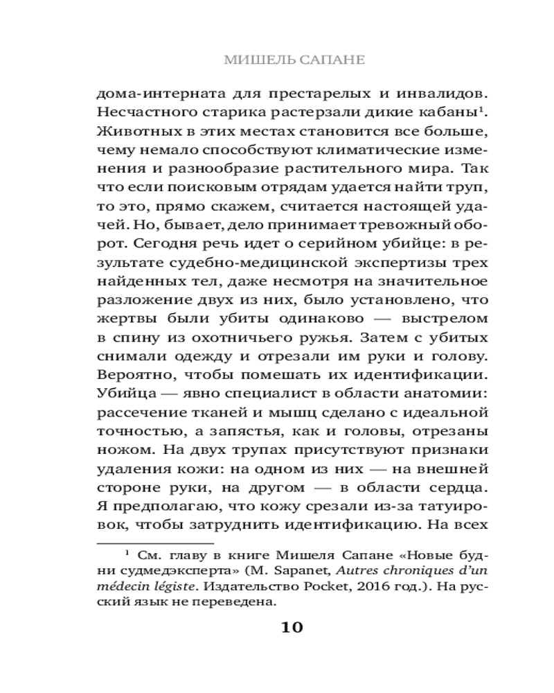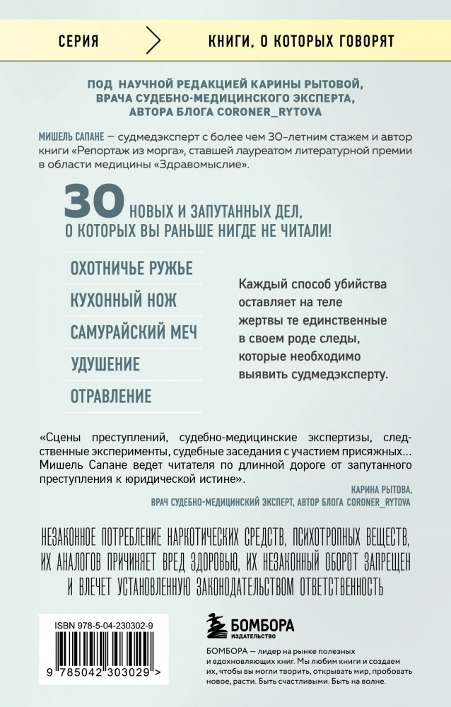 💳 Оплатить за товар можно при получении 🇰🇿 Есть бесплатная доставка по Казахстану 🎁 Копите бонусы с каждой покупки Серия: Книги, о которых говорят «Каждое исследуемое тело — это как математическая задача, которую необходимо решить», — пишет в своей новой книге Мишель Сапане. 30 новых и запутанных дел, о которых вы раньше нигде не читали! Охотничье ружьё, кухонный нож, самурайский меч, удушение, отравление — каждый способ убийства оставляет на теле жертвы те единственные в своём роде следы, которые необходимо выявить судмедэксперту. |