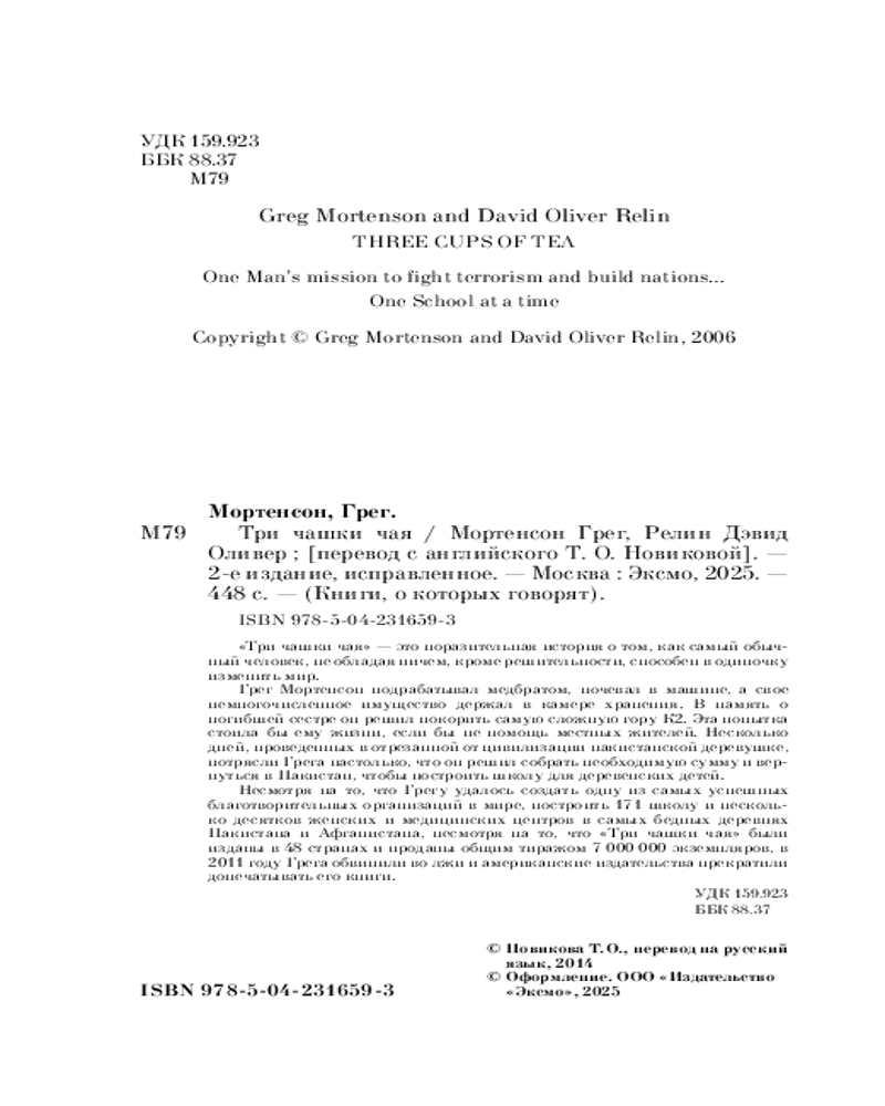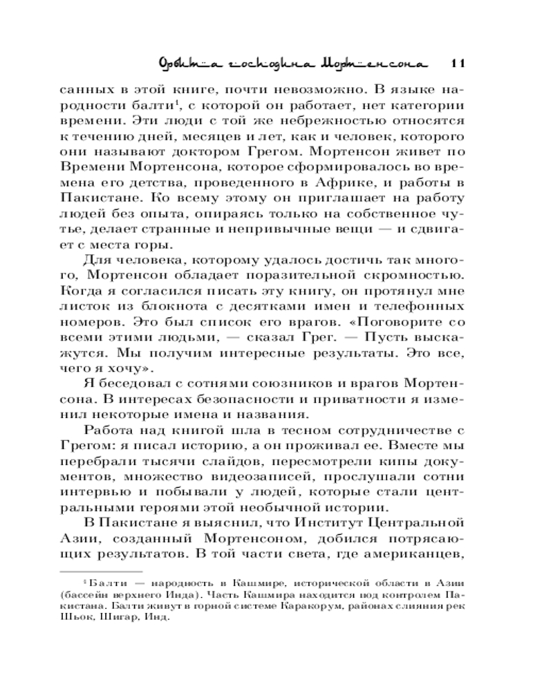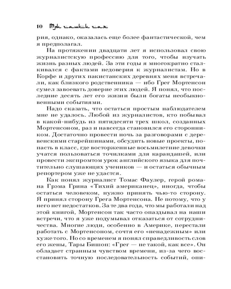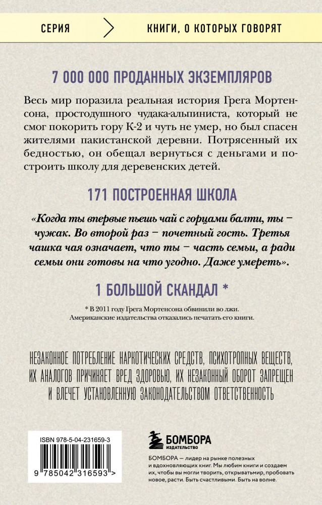 💳 Оплатить за товар можно при получении 🇰🇿 Есть бесплатная доставка по Казахстану 🎁 Копите бонусы с каждой покупки Серия: Книги, о которых говорят «Три чашки чая» — это поразительная история о том, как самый обычный человек, не обладая ничем, кроме решительности, способен в одиночку изменить мир. Грег Мортенсон подрабатывал медбратом, ночевал в машине, а свое немногочисленное имущество держал в камере хранения. В память о погибшей сестре он решил покорить самую сложную гору К2. Эта попытка чуть ли не стоила ему жизни, если бы не помощь местных жителей. Несколько дней, проведенных в отрезанной от цивилизации пакистанской деревушке, потрясли Грега настолько, что он решил собрать необходимую сумму и вернуться в Пакистан, чтобы построить школу для деревенских детей. |