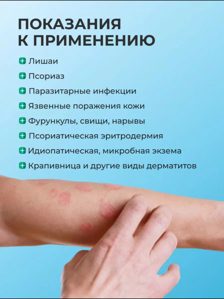 Показания включают дерматиты (в том числе атопический), дерматозы, дисгидроз, псориаз, лишай, экзему, зуд кожи, крапивницу и различные микозы. Средство эффективно снимает жжение, устраняет зуд с охлаждающим эффектом, уменьшает воспаление, увлажняет кожу, снижает болевые ощущения и ускоряет заживление повреждённых участков.