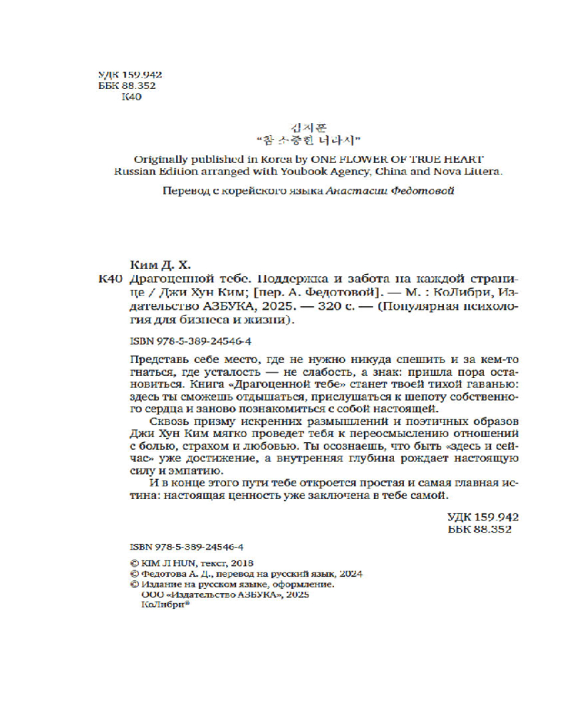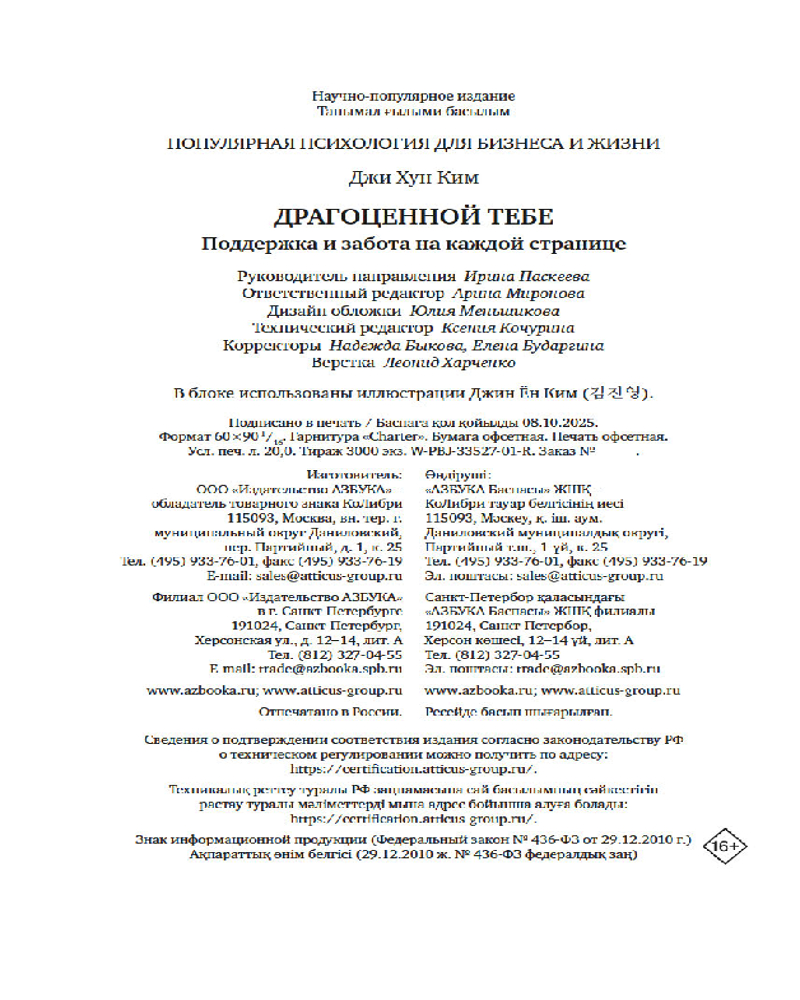 💳 Оплатить за товар можно при получении 🇰🇿 Есть бесплатная доставка по Казахстану 🎁 Копите бонусы с каждой покупки Серия: Популярная психология для бизнеса и жизни В мире, который постоянно диктует, какими мы «должны» быть, так легко забыть о своей уникальной ценности. «Драгоценной тебе» — корейская книга-бестселлер — твой личный тихий уголок поддержки, заботы и принятия. Вместо пустых слов утешения Ким Джихун предлагает пронзительные и искренние размышления, которые помогут иначе взглянуть на свою боль и переживания. |