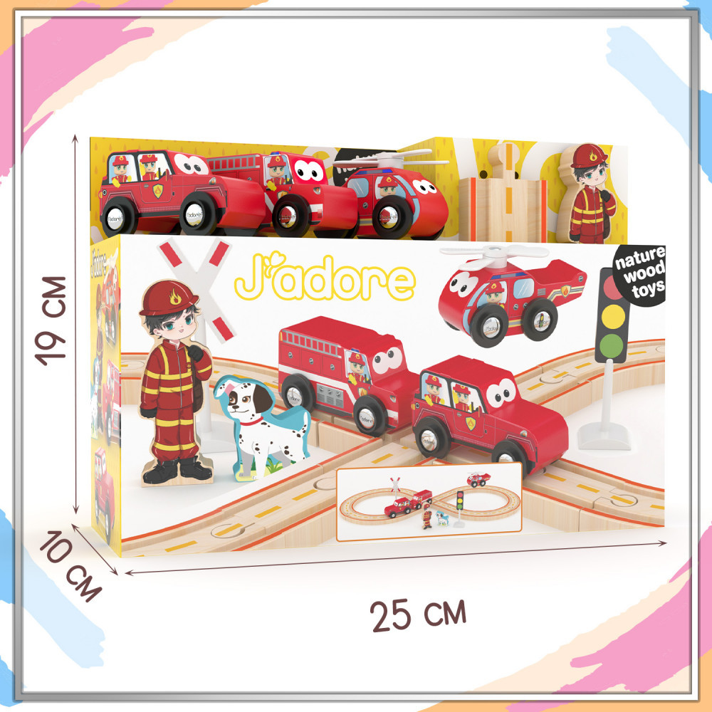 • комплектация: деревянная железная дорога «восьмёрка», три пожарные машины (внедорожник, вертолёт и стандартная пожарная машина), фигурка пожарного, фигурка собаки, дорожный знак и светофор;