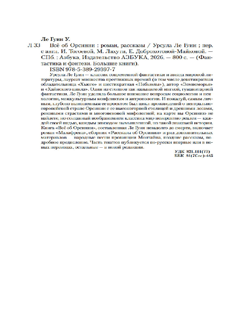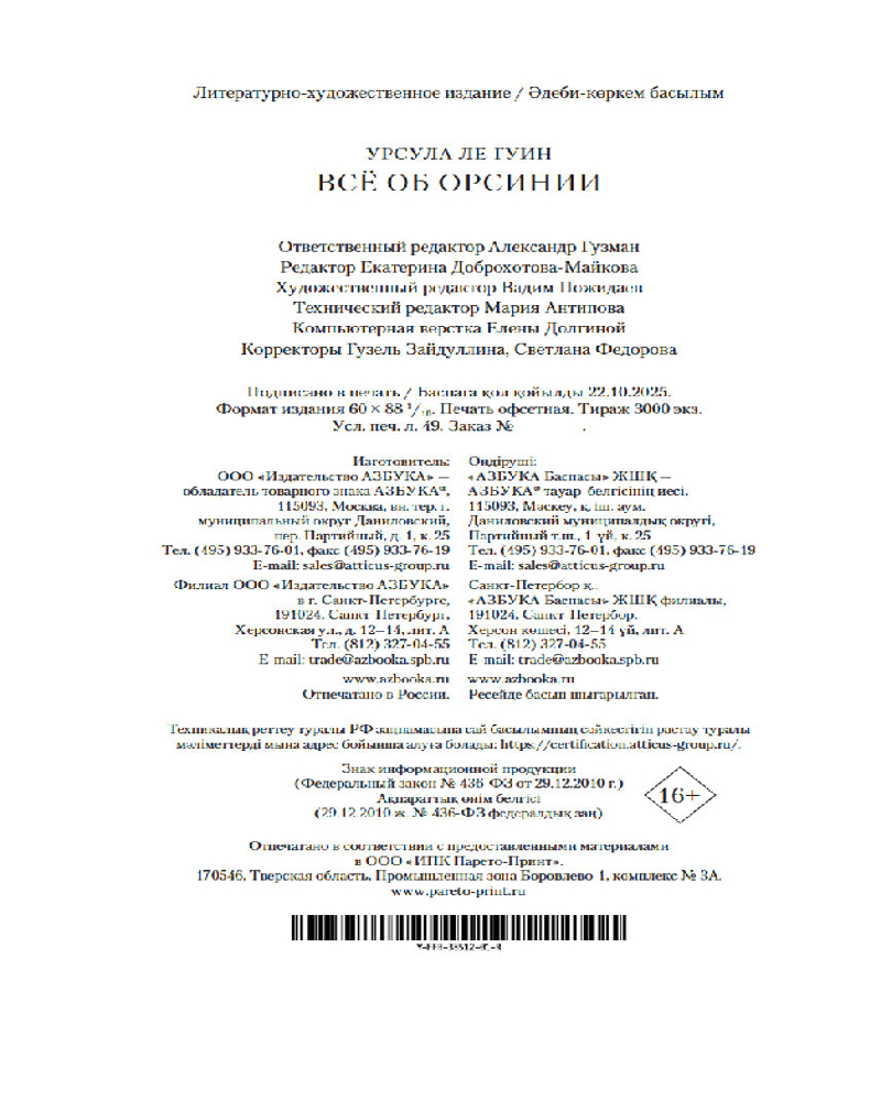 💳 Оплатить за товар можно при получении 🇰🇿 Есть бесплатная доставка по Казахстану 🎁 Копите бонусы с каждой покупки Серия: Фантастика и фэнтези. Большие книги Урсула Ле Гуин — классик современной фантастики и звезда мировой литературы, лауреат множества престижных премий (в том числе девятикратная обладательница «Хьюго» и шестикратная «Небьюлы»), автор «Земноморья» и «Хайнского цикла». Один из столпов так называемой мягкой, гуманитарной фантастики, Ле Гуин уделяла большое внимание вопросам социологии и психологии, межкультурным конфликтам и антропологии. И, пожалуй, самым личным, глубоко выношенным ее проектом был цикл произведений о центральноевропейской стране Орсинии с ее высокогорной столицей и древними лесами, роковыми страстями и многовековой мифологией; на карте вы Орсинию не найдете, но созданный воображением классика мир невероятно реален — каждой своей пядью, каждым эпизодом вымышленной, но такой знакомой истории. Книга «Всё об Орсинии», составленная Ле Гуин незадолго до смерти, включает роман «Малафрена», сборник «Рассказы об Орсинии» и ряд дополнительных материалов — народные песни провинции Монтайна, поздние рассказы, подробное предисловие. Часть текстов публикуется по-русски впервые или в новых переводах, остальные — в новой редакции. |