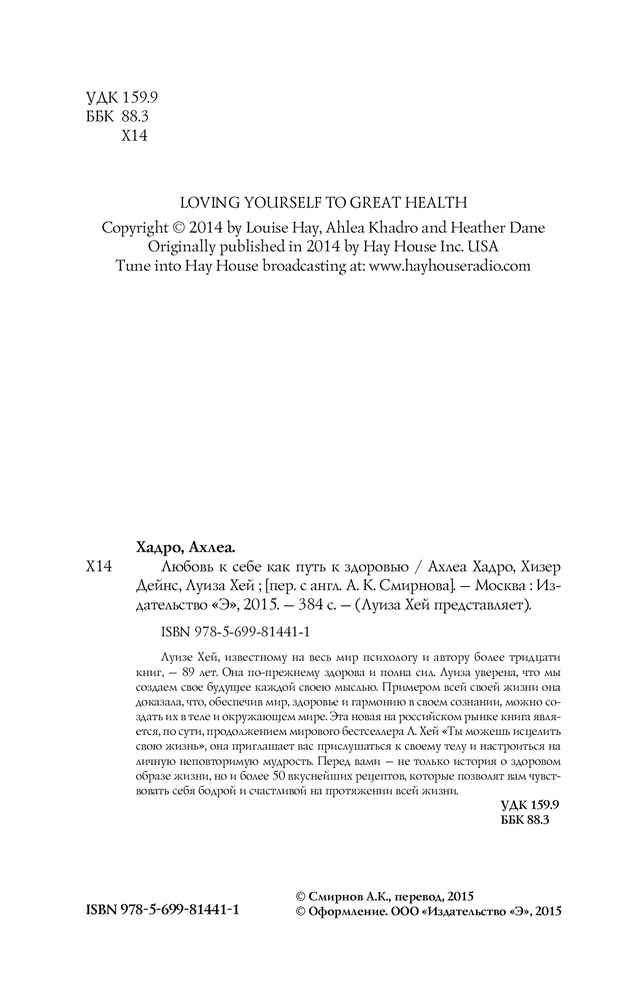 Любовь к себе как путь к здоровьюХизер Дейнс, Ахлеа Хадро, Луиза Хей В данный момент этот товар отсутствует в продаже. Возможно, у нас найдется аналогичный или похожий товар здесь. Серия: Луиза Хей представляет Луизе Хей, известному на весь мир психологу и автору более тридцати книг, — 89 лет. Она |