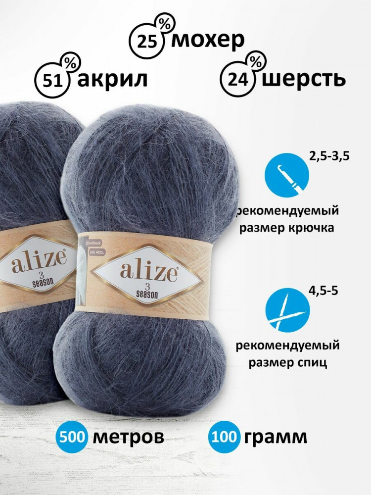Пряжа 3 Season от Alize — прекрасный выбор для увлеченных вязальщиц. Она привлекает внимание длинным, нежным и воздушным ворсом, продуманной цветовой палитрой и высоким качеством. Благодаря большому содержанию натуральных волокон — шерсти и тонкого мохера — вещи из этой пряжи отлично согревают в прохладную погоду. Акриловое волокно придает готовому полотну прочность, устойчивость к усадке и приятную мягкую фактуру. В процессе вязания пряжа Alize 3 Season приятно скользит по спицам, не цепляясь и не образуя узелков. Рекомендуем вязать не слишком плотно, чтобы ворс лучше раскрылся. Аккуратно постирайте готовую вещь со специальным средством для шерсти и кондиционером, и ворс станет еще более мягким.