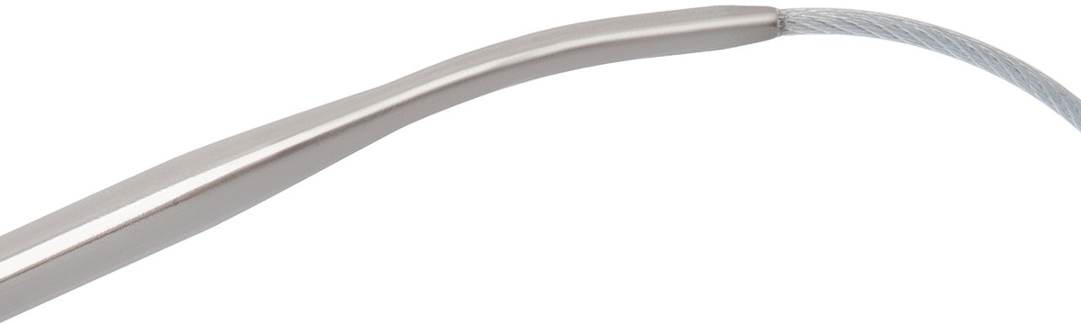 Закругленные концы легко подцепляют петли, увеличивая скорость вязания. Кроме того, на переходе к тросику спицы изогнуты — это позволяет петлям легко соскальзывать на тросик, не создавая дополнительных трудностей для вязальщицы. Место соединения спицы и тросика выполнено идеально гладким, поэтому волокна пряжи не цепляются. Спицы круговые в наборе позволят работать с любыми видами пряжи без лишних усилий. Металлический тросик, покрытый тонким полимерным слоем, отличается высокой прочностью и гибкостью. Он не перекручивается в процессе работы, позволяя сосредоточиться на творческом процессе.